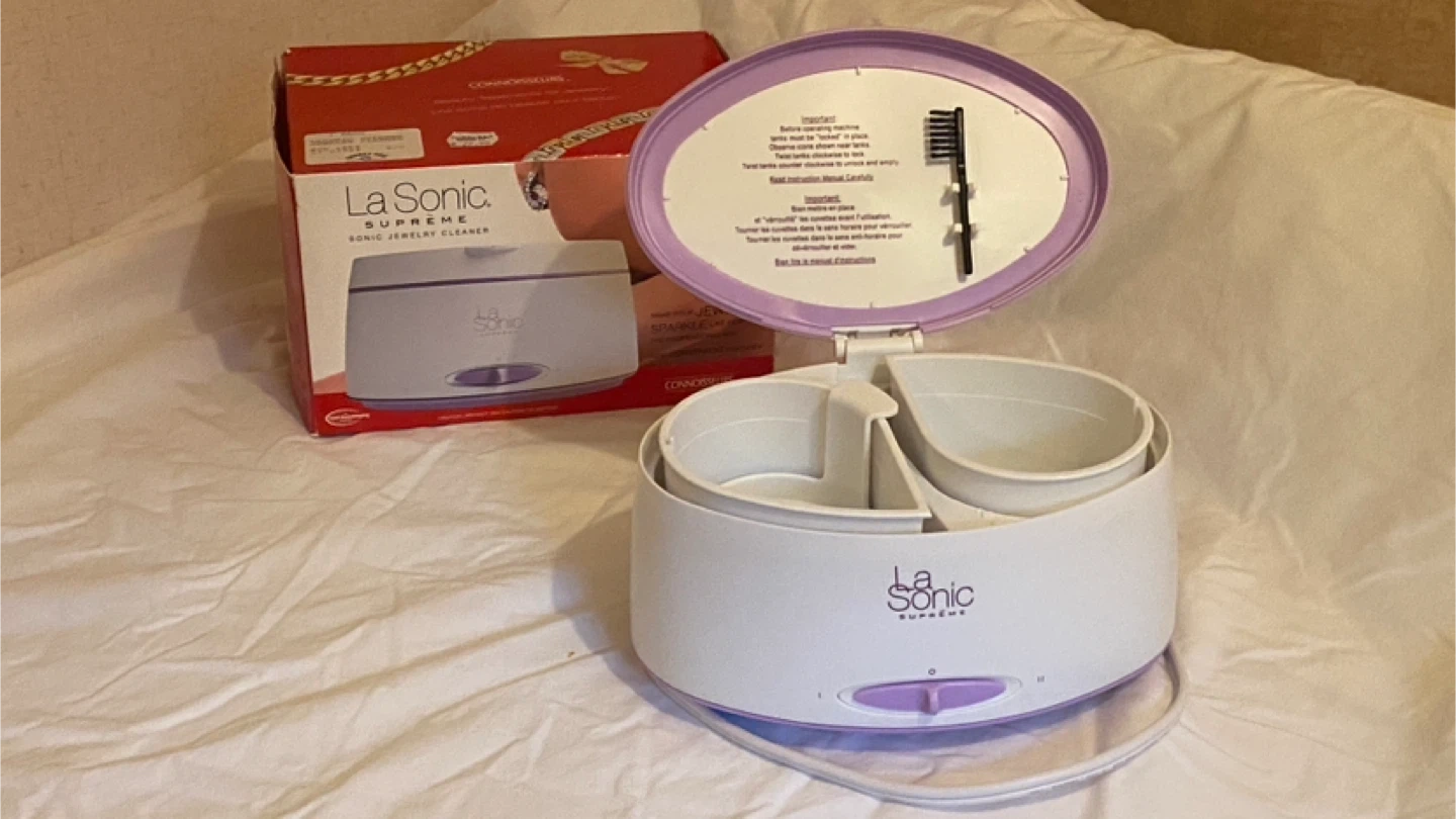 Keep your jewelry sparkling with this La Sonic Supreme sonic jewelry cleaner! It comes with the original box and is in great condition. It's a professional way to keep your jewelry looking new with convenient features