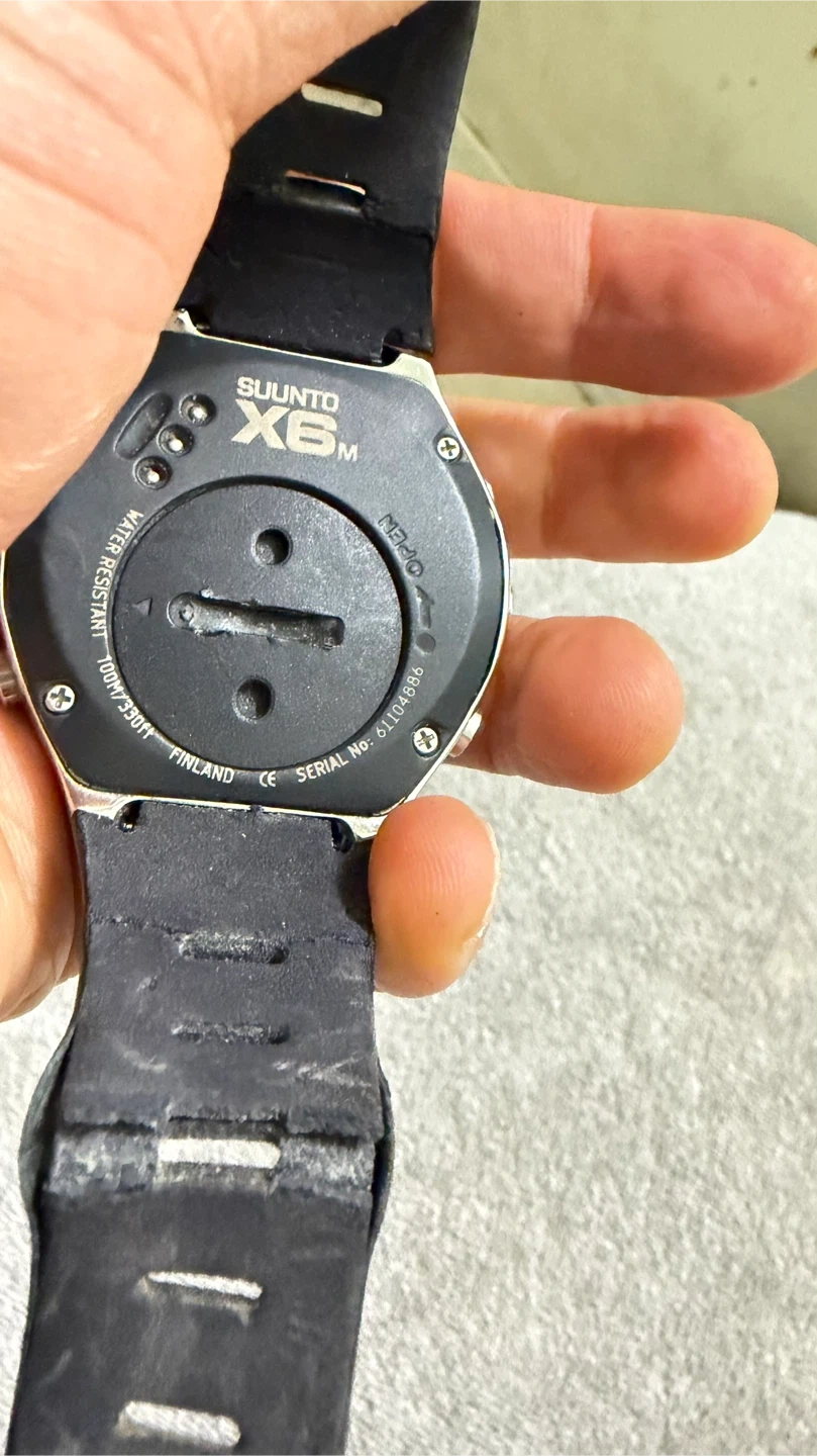 Selling a Suunto X6M watch. It shows signs of wear on the band, but the watch face itself is in good condition. It's a reliable and functional watch for outdoor activities. Needs a new battery