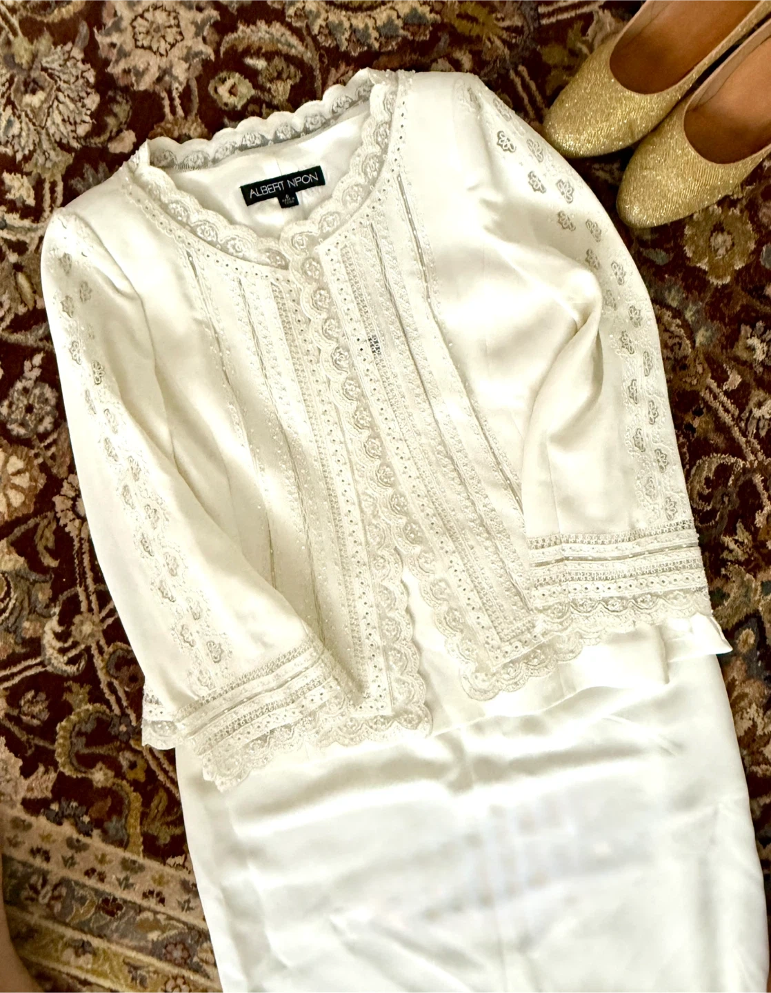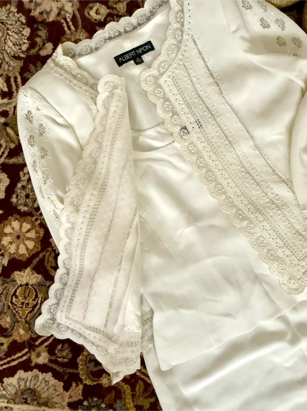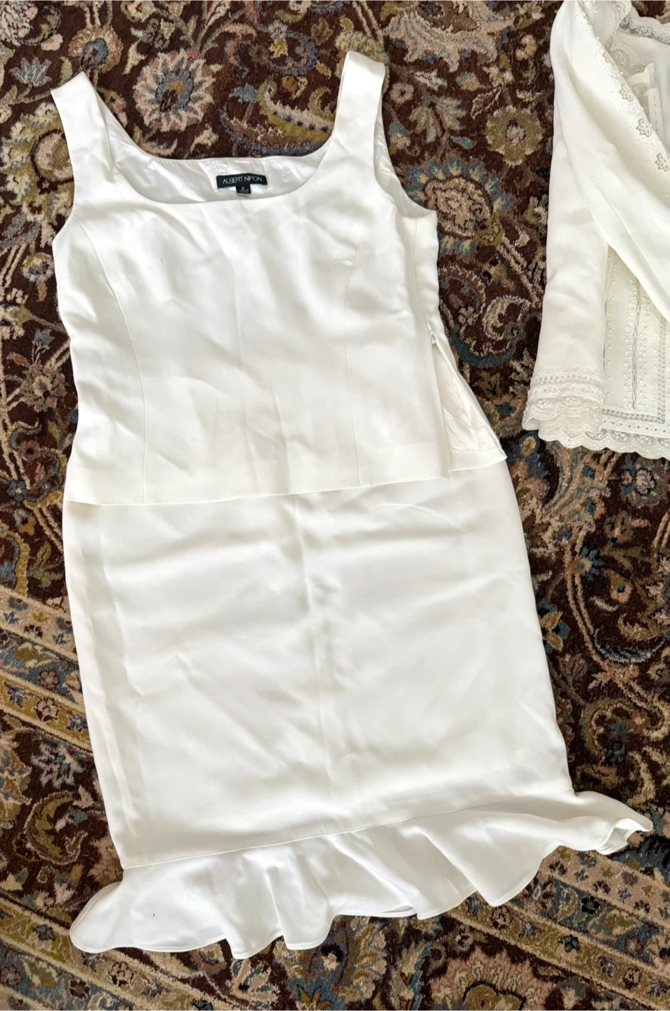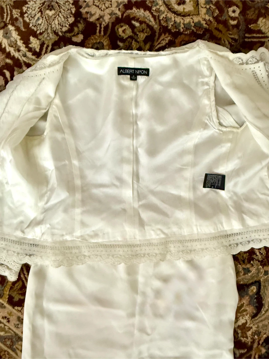 Selling a beautiful Albert Nipon 3-piece jacket set! It's a lovely white colour and size 6. Perfect for a special occasion or a classic addition to your wardrobe. The jacket features delicate lace detailing, the skirt has a flirty peplum bottom, and a camisole has a side zipper. Warn once.