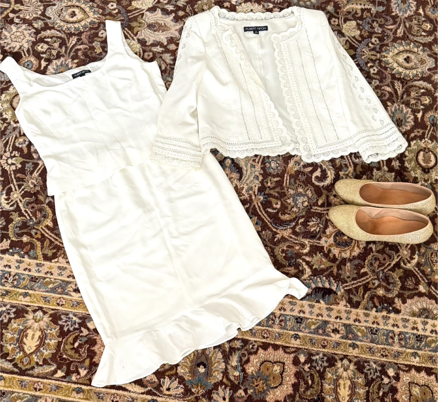 Selling a beautiful Albert Nipon 3-piece jacket set! It's a lovely white colour and size 6. Perfect for a special occasion or a classic addition to your wardrobe. The jacket features delicate lace detailing, the skirt has a flirty peplum bottom, and a camisole has a side zipper. Warn once.