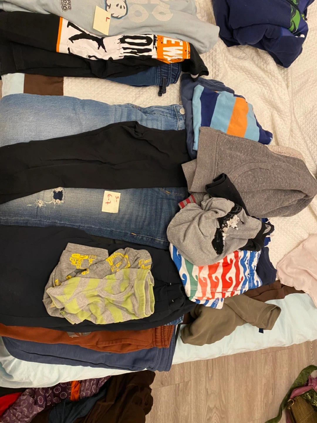 mixed bundle of kids clothes, mostly size 5-7. There are various items including jeans, pants, shirts, and sweaters. Some items show signs of wear, such as rips in the jeans. Great for everyday wear!