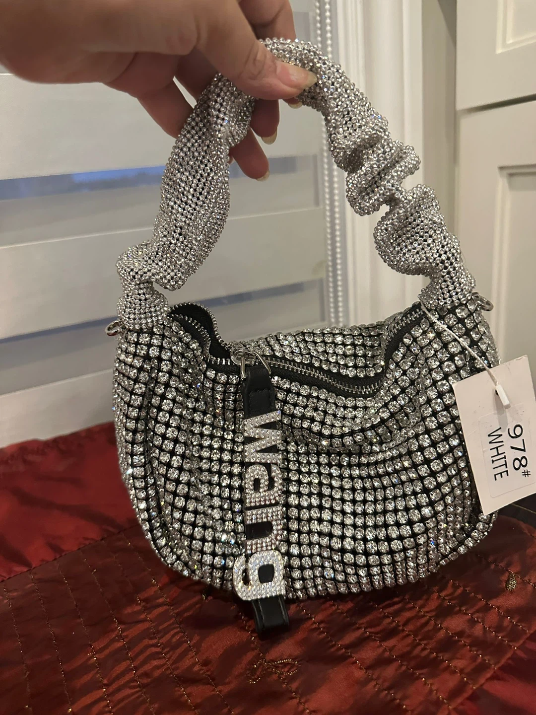 Selling a gorgeous Alexander Wang bag! It's covered in sparkling white rhinestones and has a scrunchie-style handle. The bag is in great condition and ready to add some bling to your wardrobe
