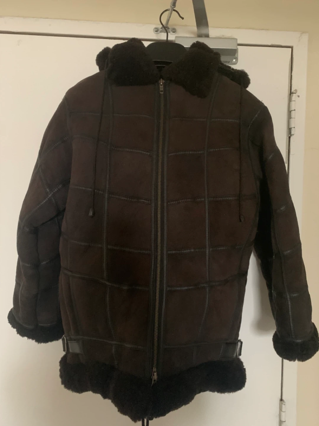 Here’s a cozy and super warm chocolate brown natural shearling leather winter jacket for woman or girl in good condition.