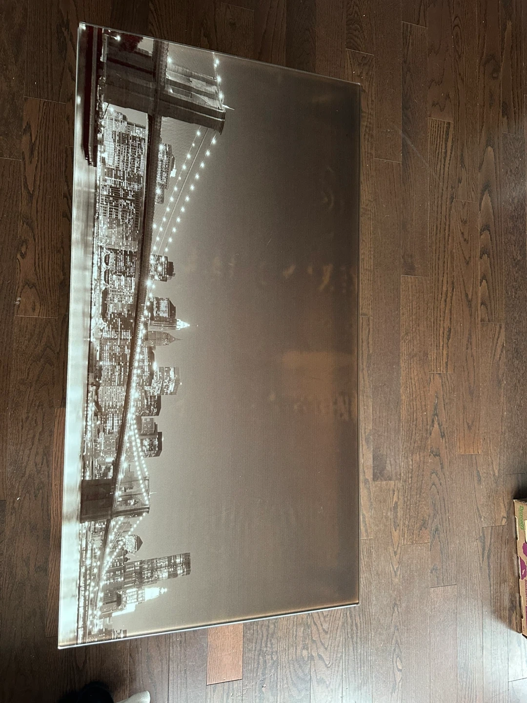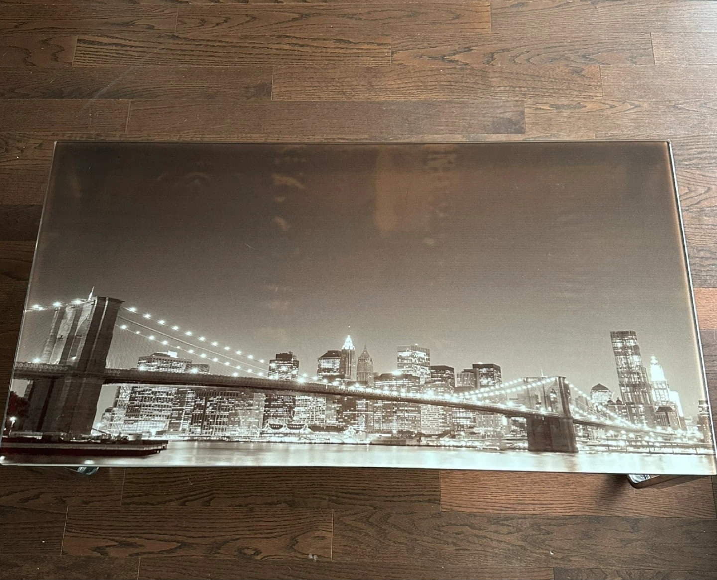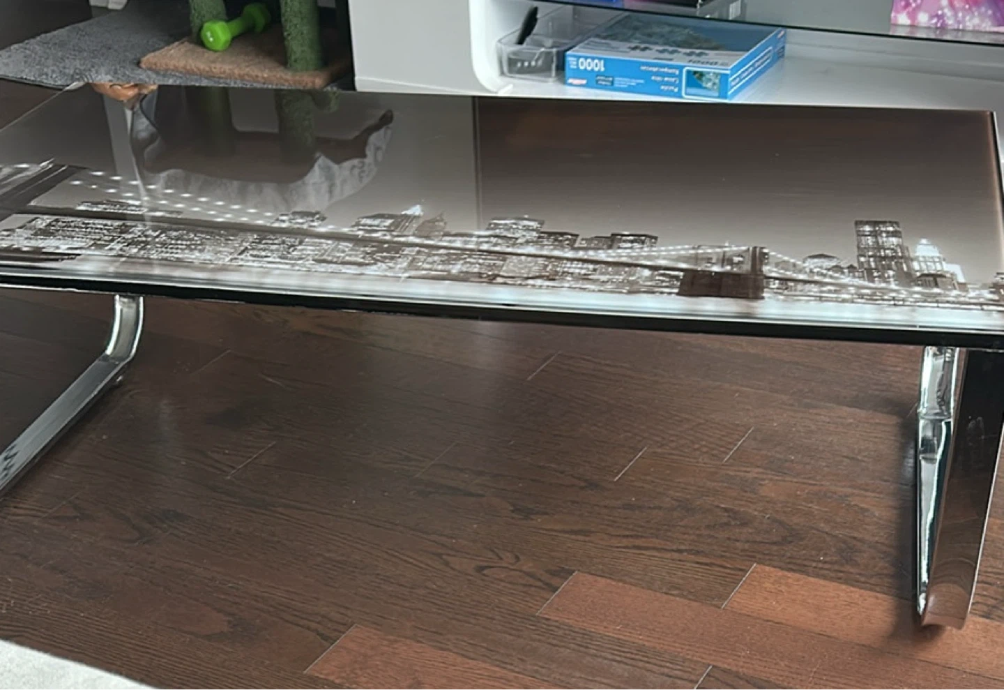 Selling an Ebern Designs Lannie Glass Top Coffee Table. It features a cityscape design on the glass top and chrome legs. Originally bought for $149.99