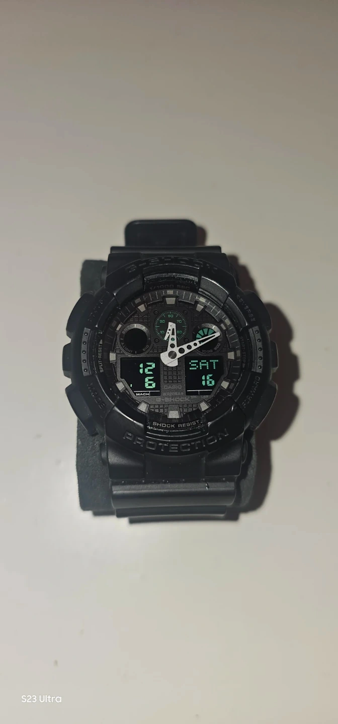 Selling a Casio G-Shock GA-100MB watch in black. It's in great condition and ready for a new wrist! This watch is antimagnetic and features a shock-resistant structure and is water-resistant up to 200 meters. It's a durable and stylish timepiece for everyday wear.