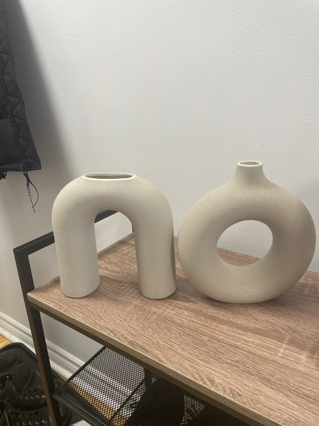 Selling a set of two beige ceramic vases! They're in great condition and would look lovely in any room. The set includes a U-shaped vase and a round vase with a hole in the center. Perfect for adding a touch of modern elegance to your home decor