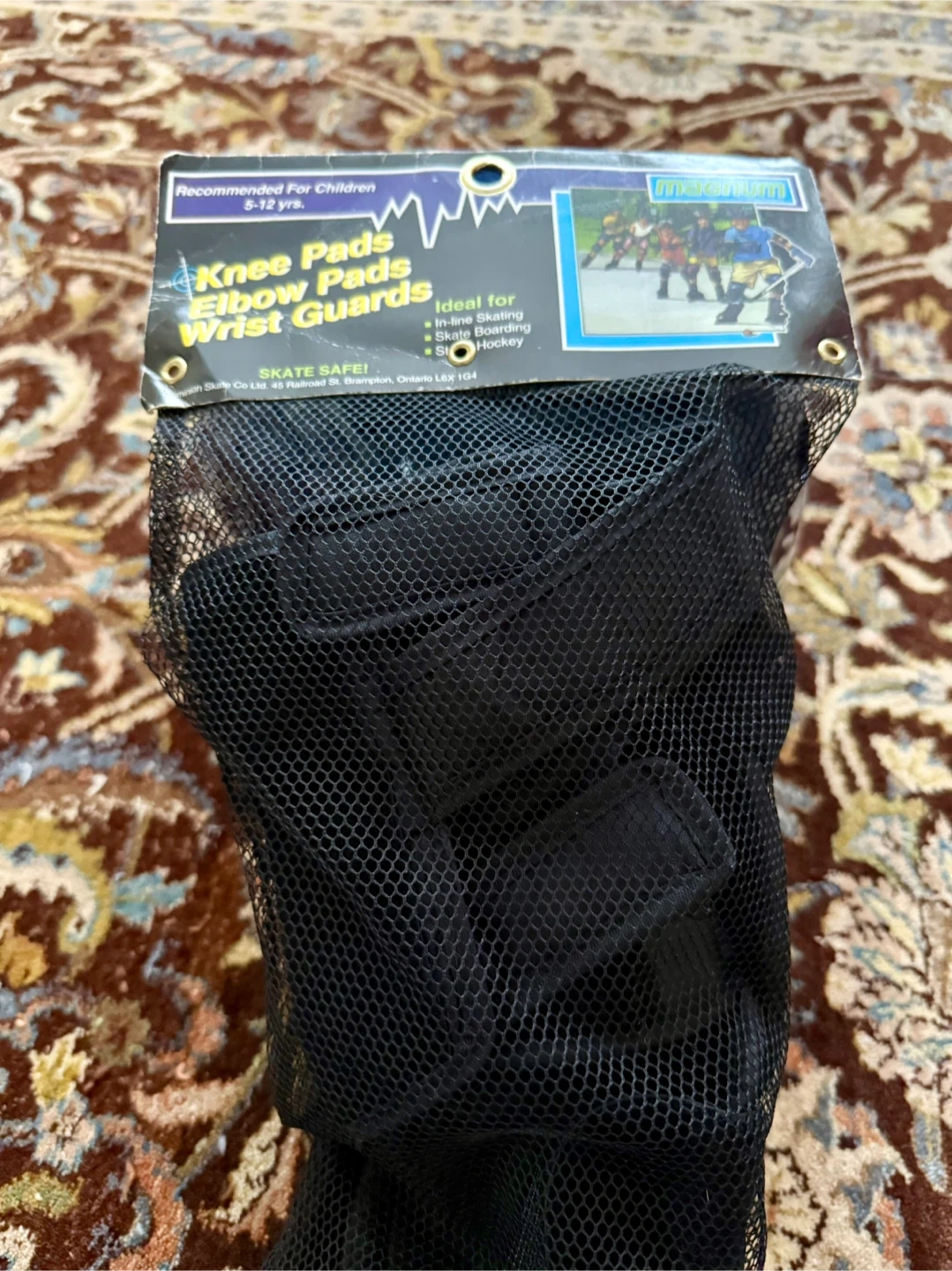 Recommended for children aged 7-12 years. The set includes knee pads, elbow pads, and wrist guards, ideal for in-line skating, skateboarding, and hockey!