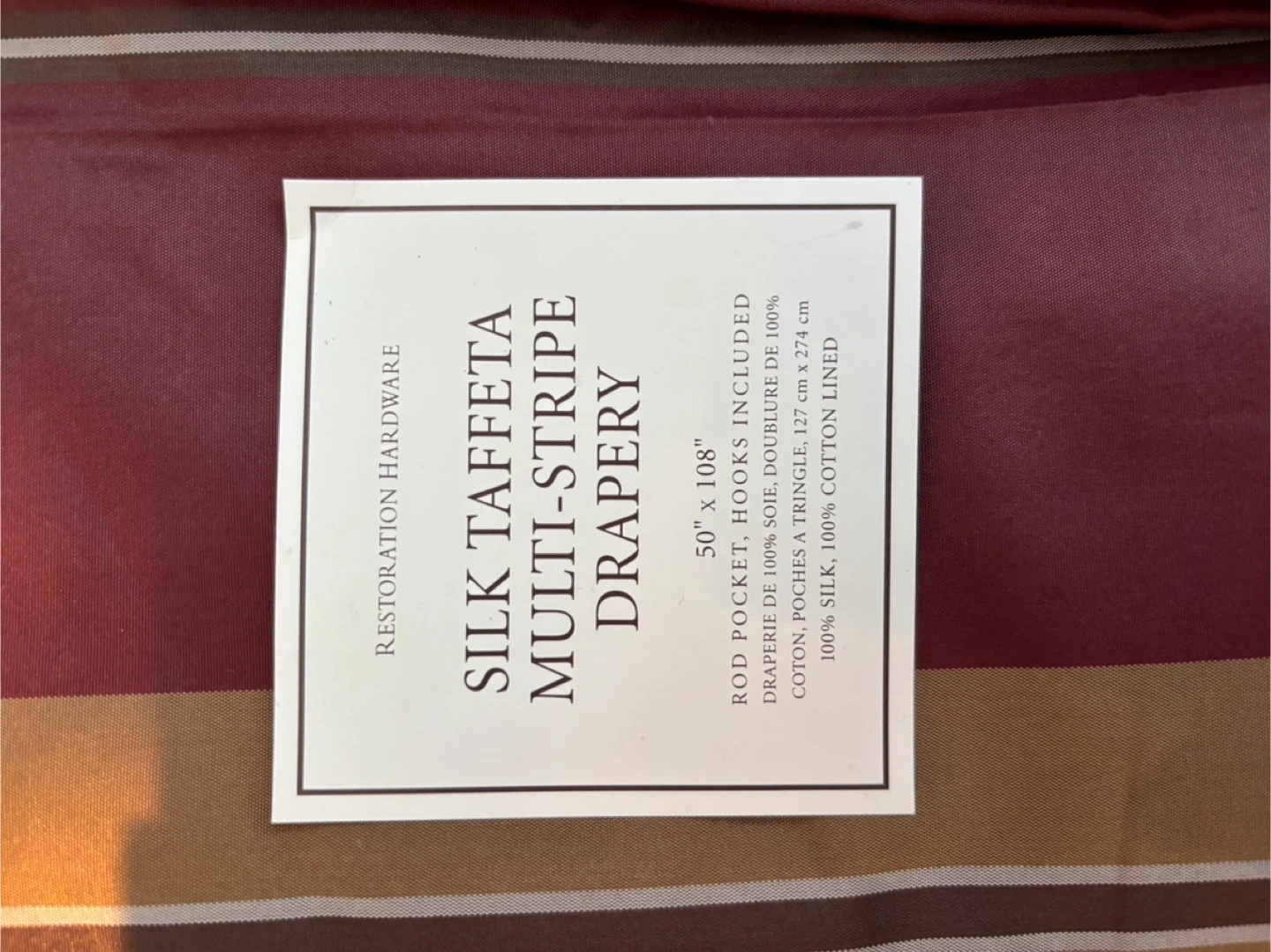 Selling a set of Restoration Hardware silk taffeta multi-stripe drapery. The size is 50" x 108". It features a rod pocket. The drapery is made of 100% silk and has a 100% cotton lining