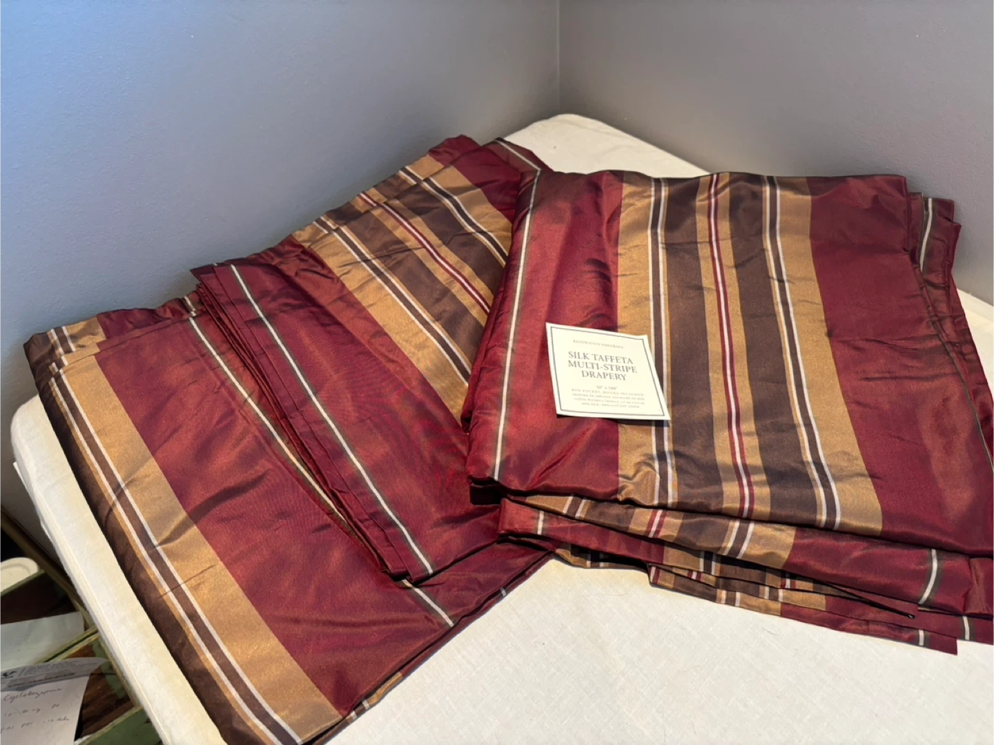 Selling a set of Restoration Hardware silk taffeta multi-stripe drapery. The size is 50" x 108". It features a rod pocket. The drapery is made of 100% silk and has a 100% cotton lining