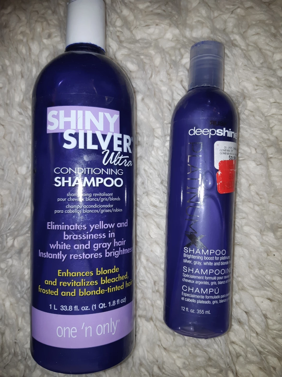 Selling two bottles of shampoo! One is Shiny Silver Ultra Conditioning Shampoo (1L). The other is deepshine Platinum Shampoo (12 fl. oz / 355 mL). Great for brightening platinum, silver, gray, white, and blonde hair