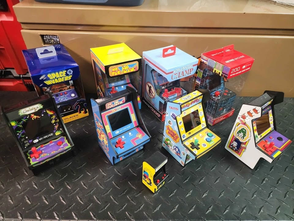 Selling a mixed lot of mini arcade machines, classic retro-style “cabinet” replicas perfect for a game room, home office, or collection. All units are from recognized mini-arcade lines (eg. My Arcade) and include fan-favorite titles such as: Pac-Man / Ms. Pac-Man, Galaga (and similar space-shooter retro games), Bubble Bobble, Space Invaders / other retro classics (see pictures), Karate Champ / vintage-style fighting / arcade-cabinet games. These are small-format tabletop/handheld-cabinet style units: compact, portable, and great for display or casual play. They can run on AA batteries or via USB (depending on model) and feature full-color screen, joystick/buttons, built-in speaker, and collectible artwork. Some are used, some brand new in a sealed box. All in good working condition. Asking $500obo. Let me know if you have any questions!