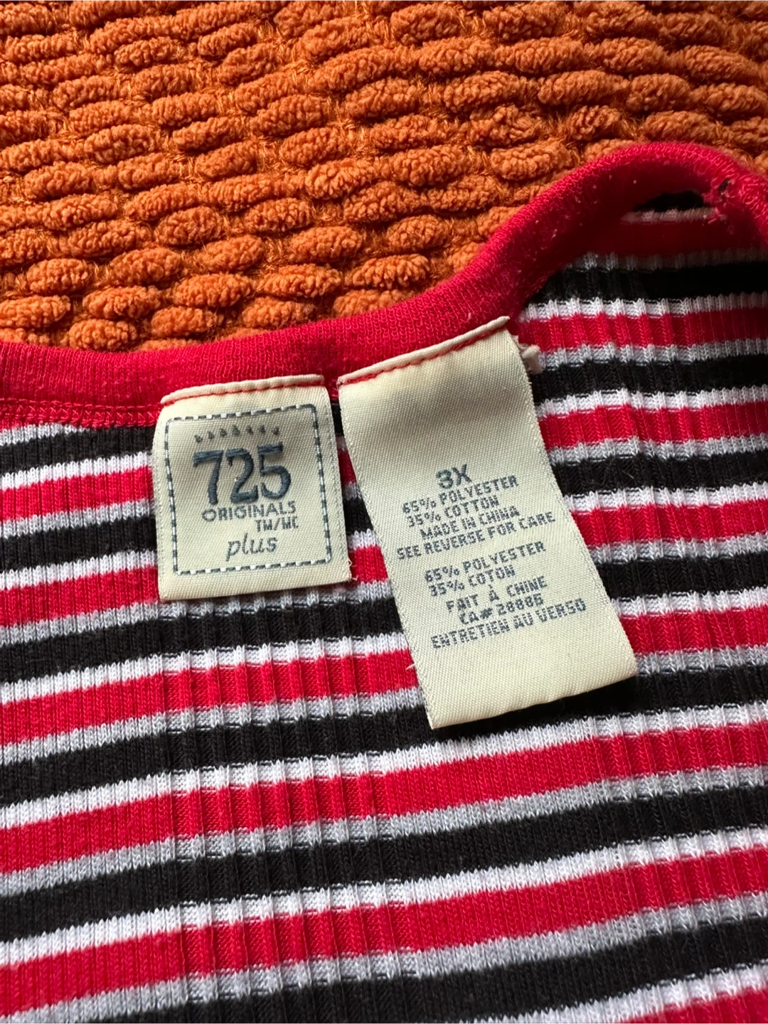 Here's a cute tank top from 725 Originals in a plus size 3X. It features a striped pattern in red, white, and black. The material is 65% polyester and 35% cotton.