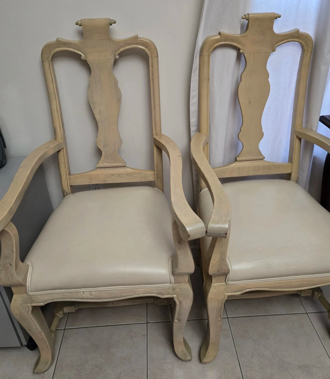Selling a set of two vintage dining chairs. They have a unique, classic design and could be a great addition to your dining room or kitchen. They are in good condition, showing some signs of wear consistent with their age.