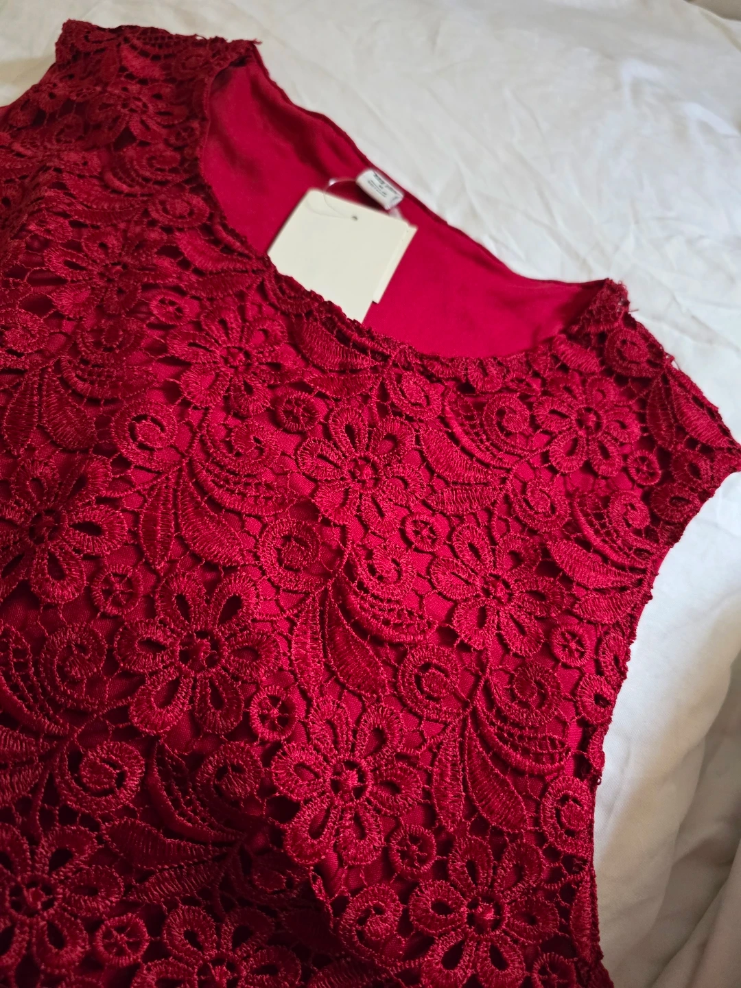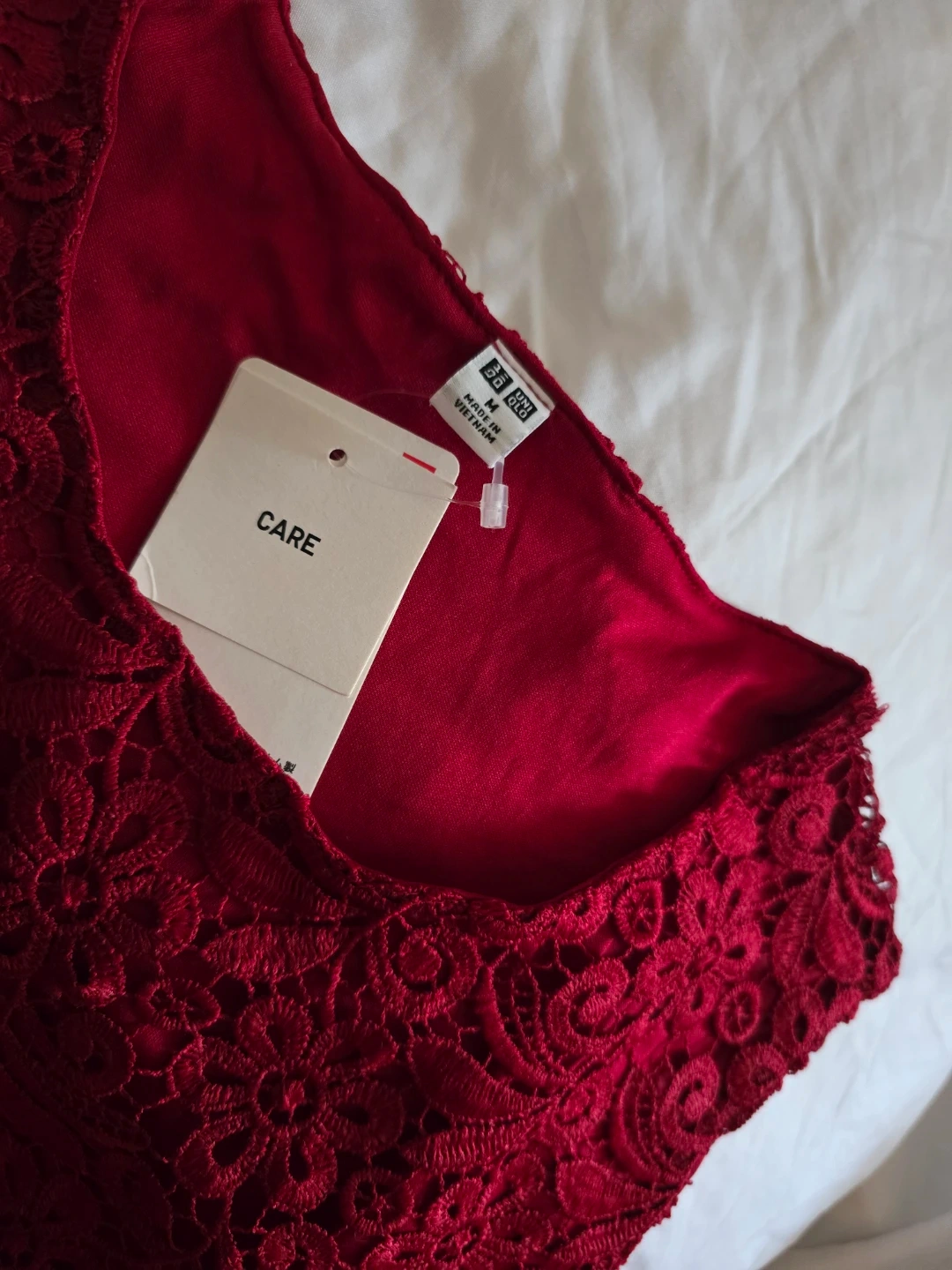 You'll get a beautiful red lace sleeveless top from Uniqlo! It's a size medium and in great condition. Perfect for a night out or dressing up a casual outfit. The lace detailing is really pretty! From Japan Uniqlo. Phoro taken with natural light from my window.