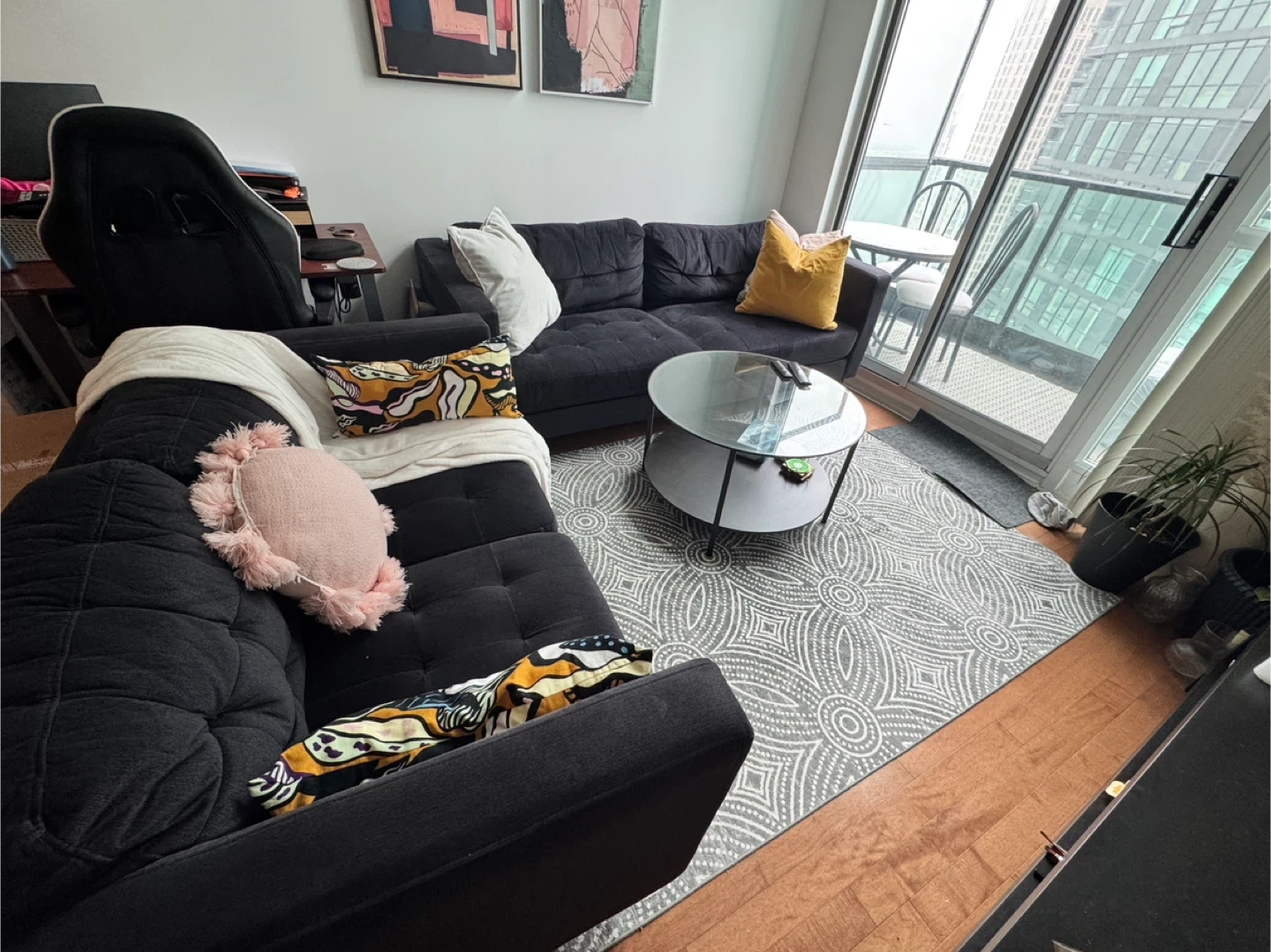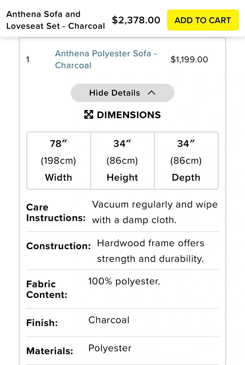 Selling an Anthena sofa and loveseat set in charcoal colour. The sofa is 78" wide, 34" high, and 34" deep. The loveseat is 56" wide, 34" high, and 34" deep.