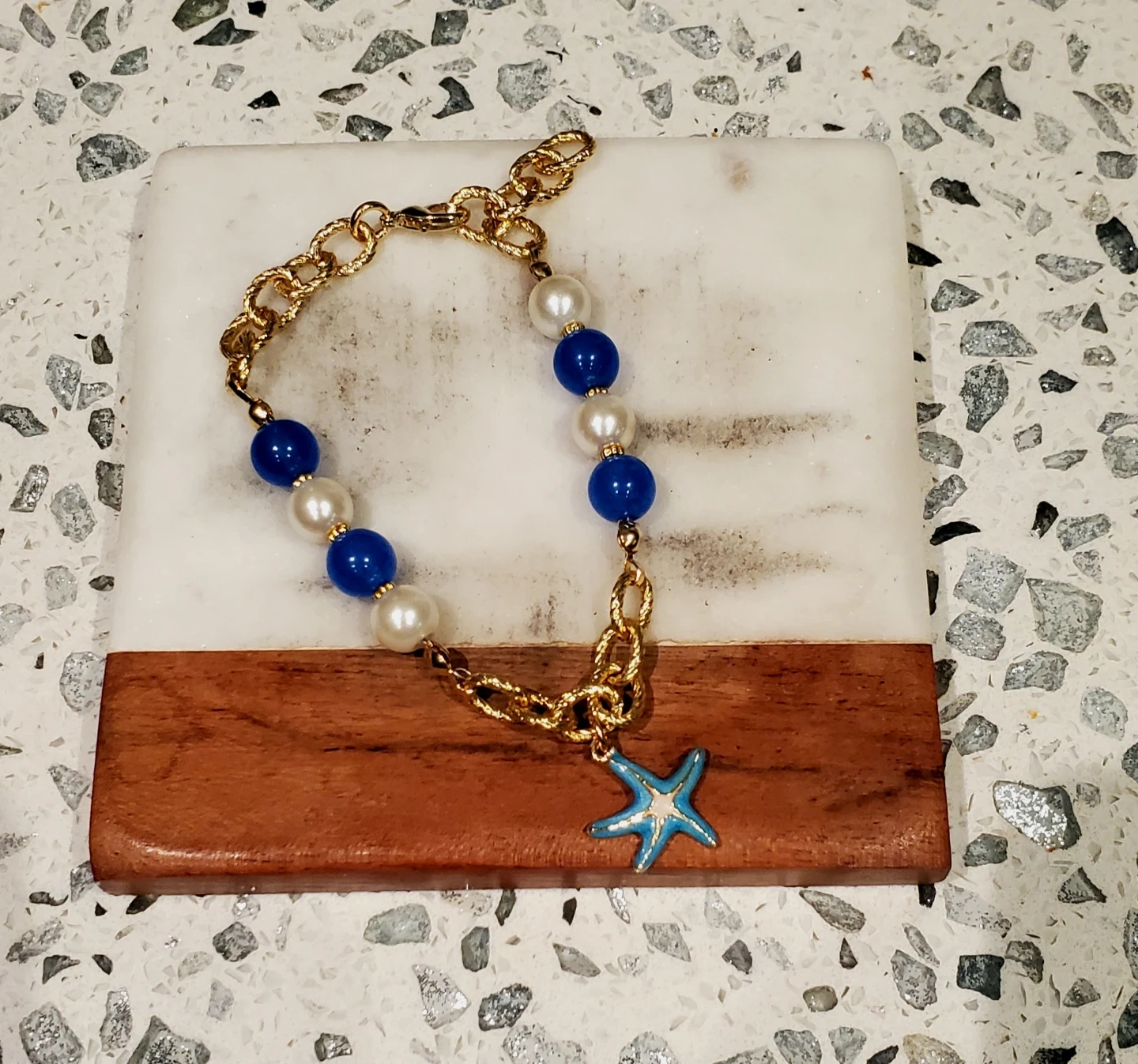This is a cute charm bracelet with a gold chain. It features blue jade and pearl beads, and a blue starfish charm. New custom made ✨️