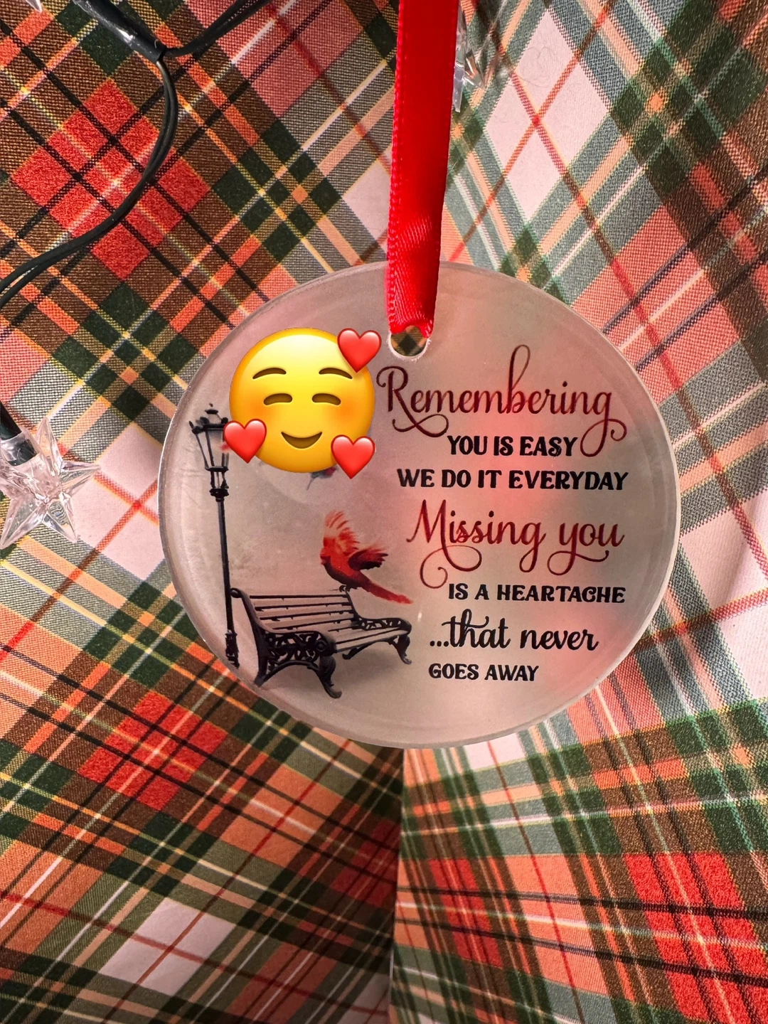 Memorial ornament with a red ribbon for hanging. The ornament has a picture of a bird sitting on a bench with a light post next to it. The text on the ornament says, 'Remembering you is easy, we do it everyday. Missing you is a heartache...that never goes away'