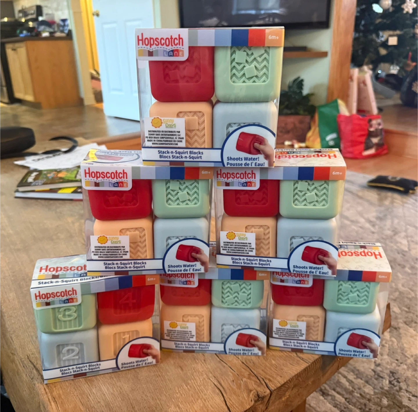 These Hopscotch Lane Stack-n-Squirt Blocks are perfect for little ones aged 6 months and up! The set includes colourful blocks with numbers and fun designs. They even shoot water! The box is included