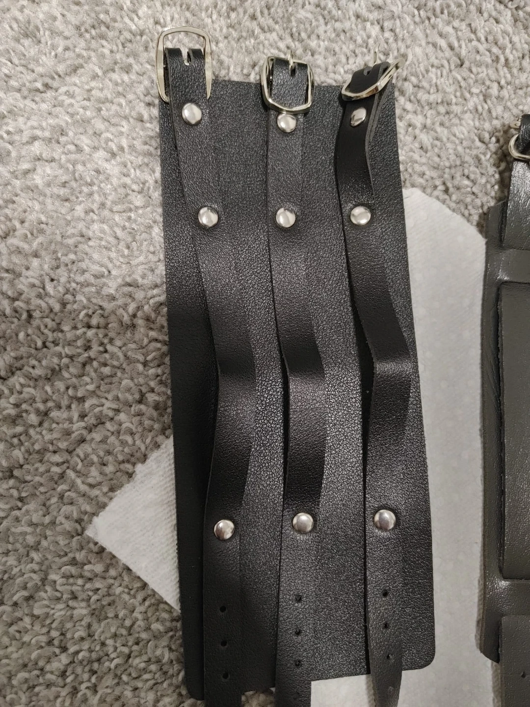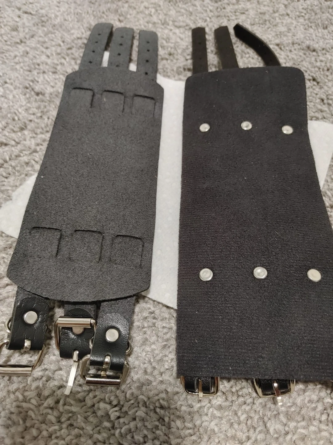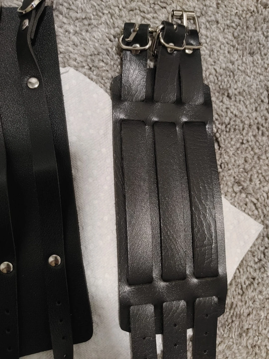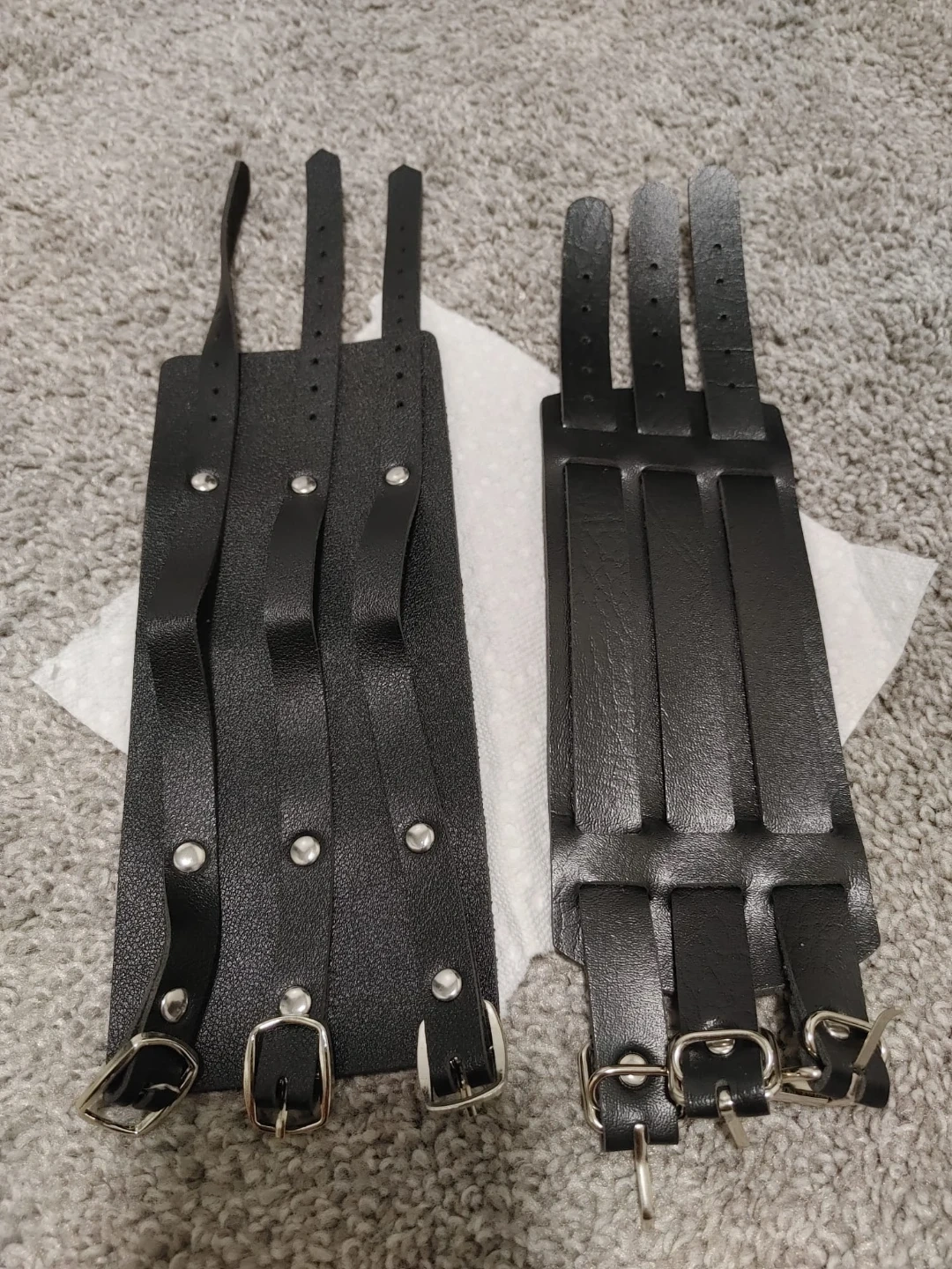 Selling a pair of All New black leather wrist cuffs. They feature adjustable straps. Genuine leather