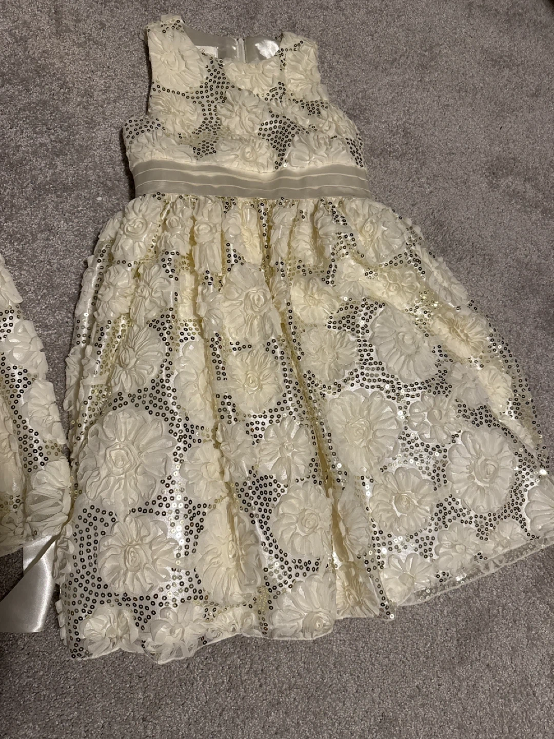 I'm selling a girls' dress. Used as flower girl dresses, but would be perfect for Christmas events. They are a floral pattern with sequins. The colour is off-white. Perfect for a special occasion! I will sell separately if interested in only one price is $50 for two.