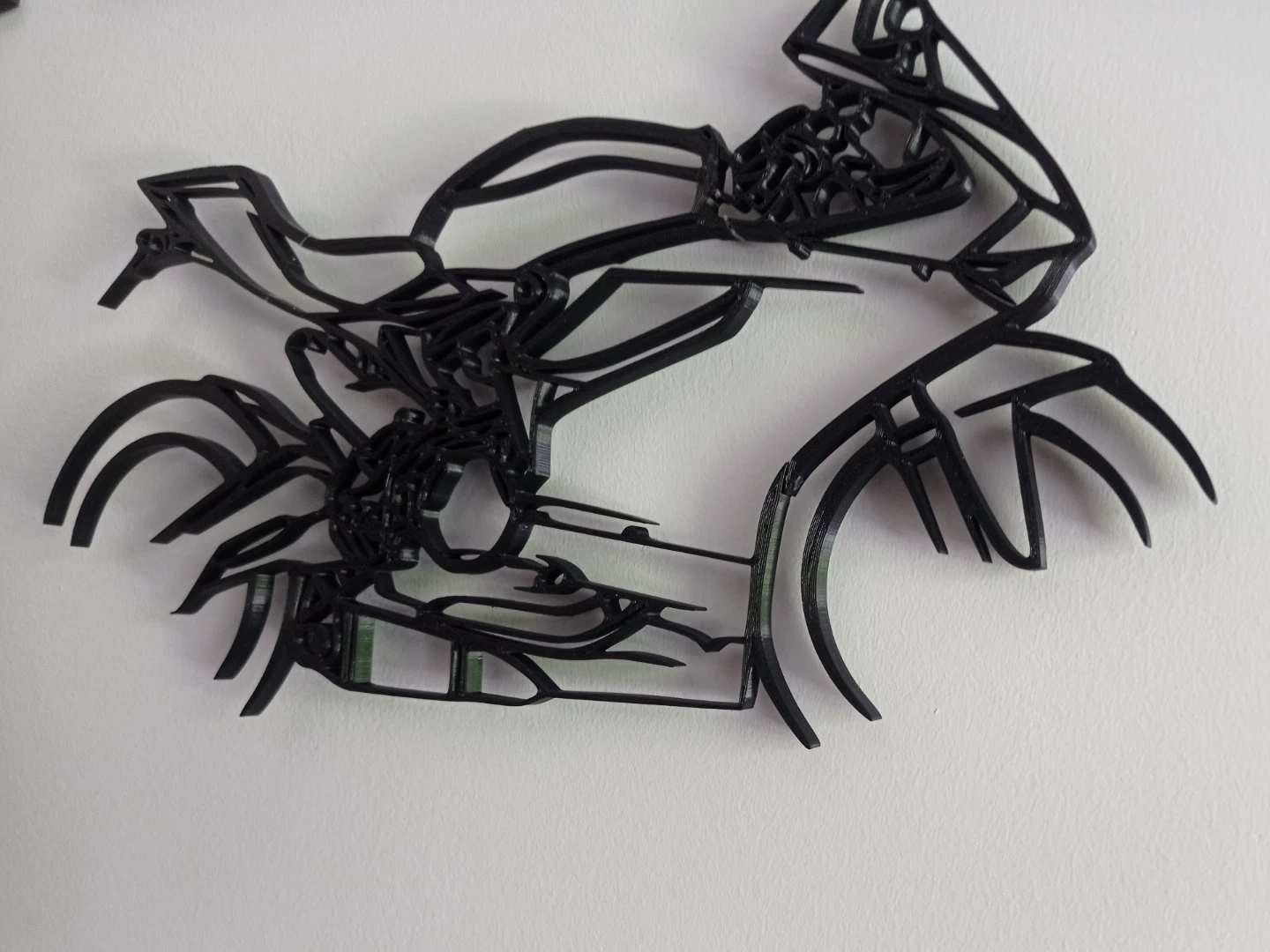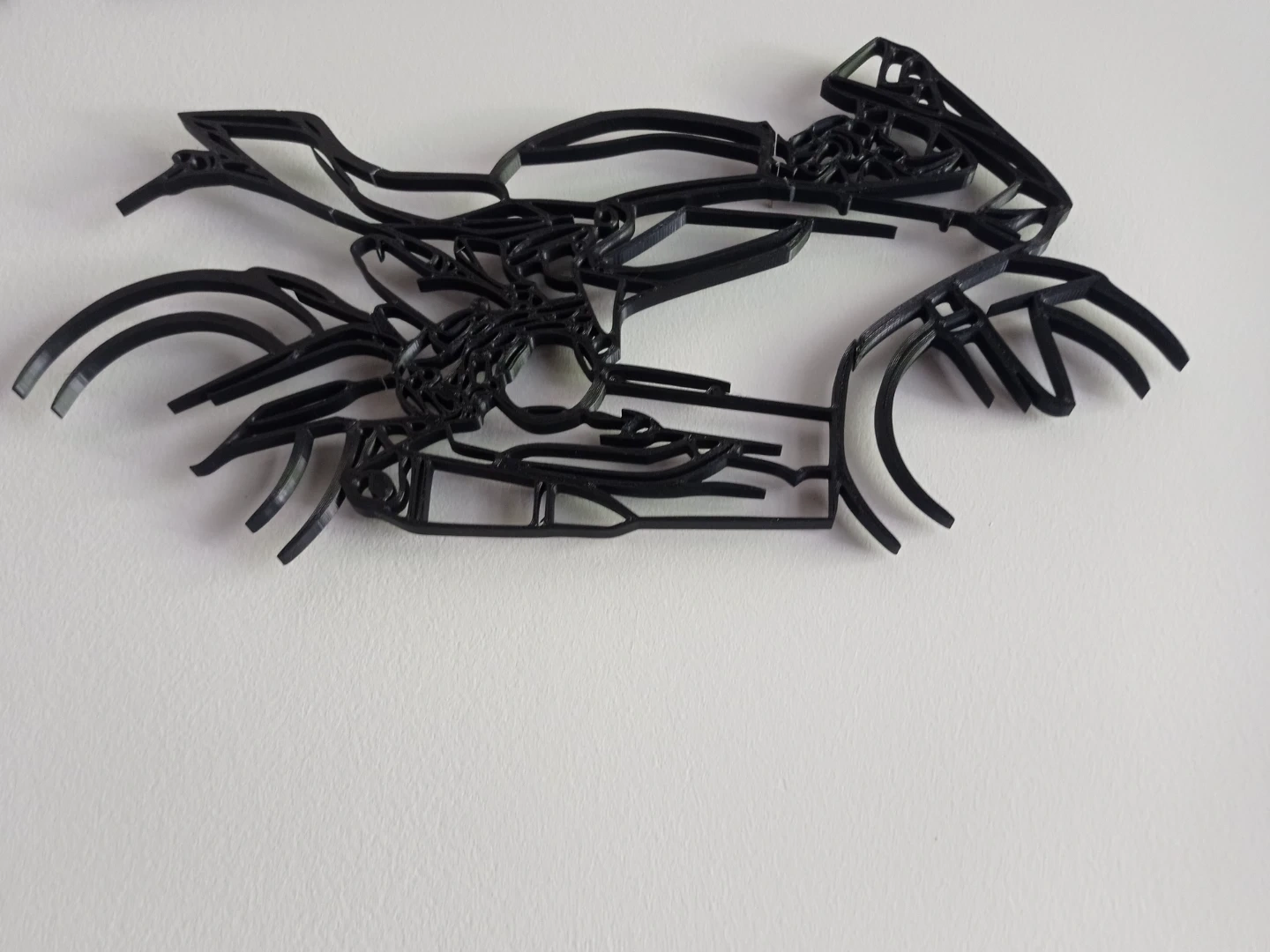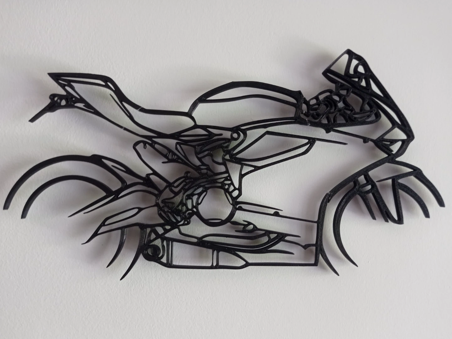 Selling a unique piece of wall art: a 3D printed motorcycle! It's a cool, minimalist design that would look great in a garage, office, or any room with a modern aesthetic. The color is black and the material is plastic, making it lightweight and easy to hang. It's in excellent condition!