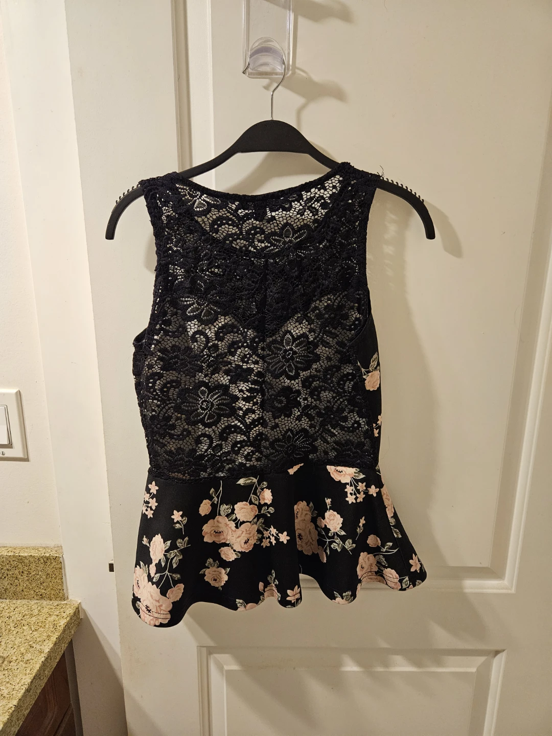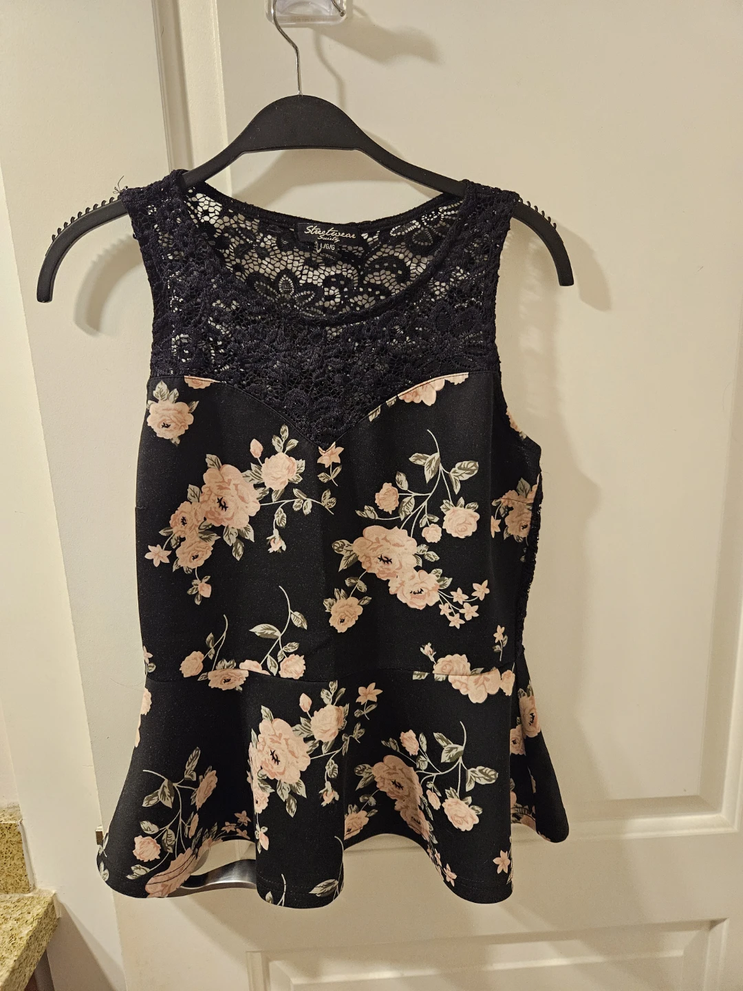 This is a Torrid black floral lace peplum top. It's in great condition and would be a stylish addition to your wardrobe!