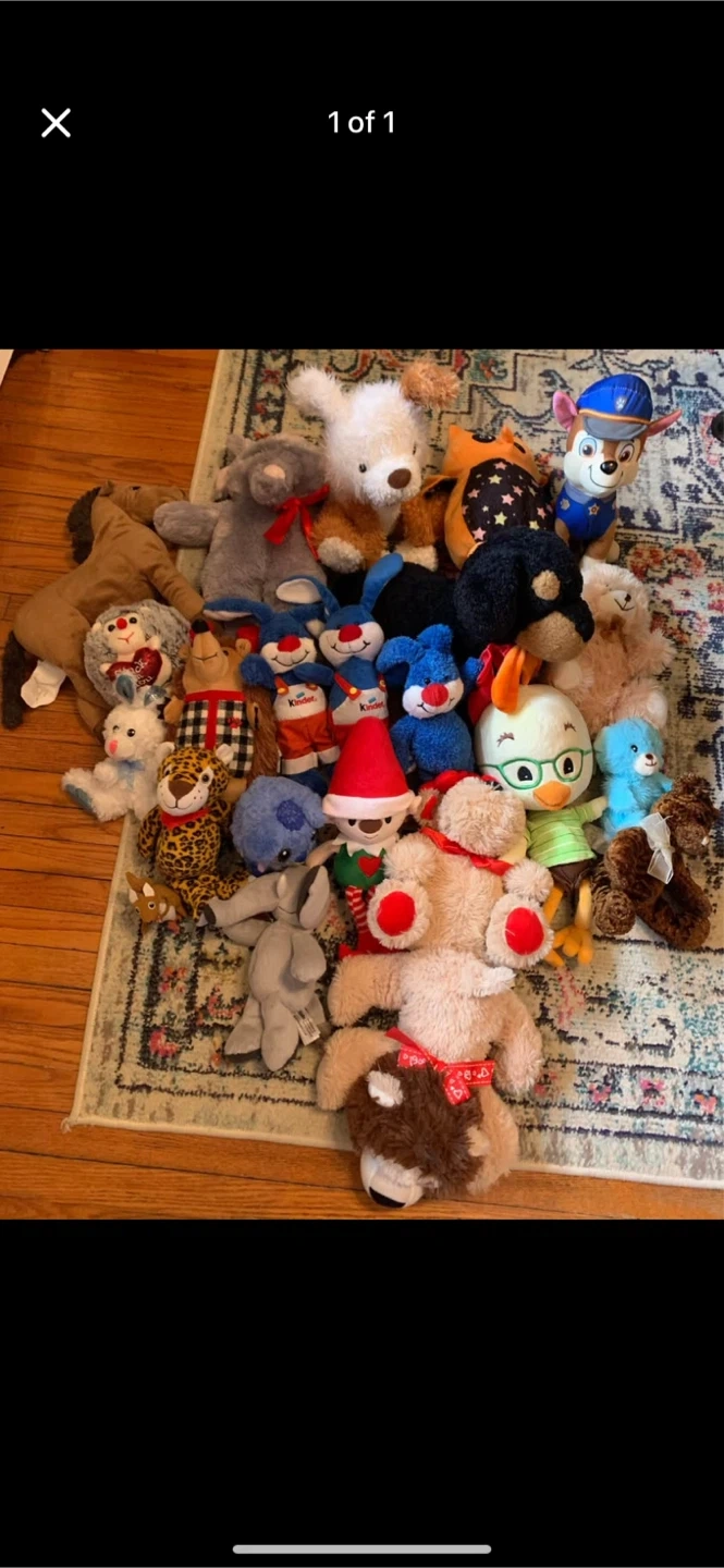 Assorted bag of stuffed animals. No longer need them, they are in good condition. Has paw patrol, a Disney Chicken Little plush toy.
