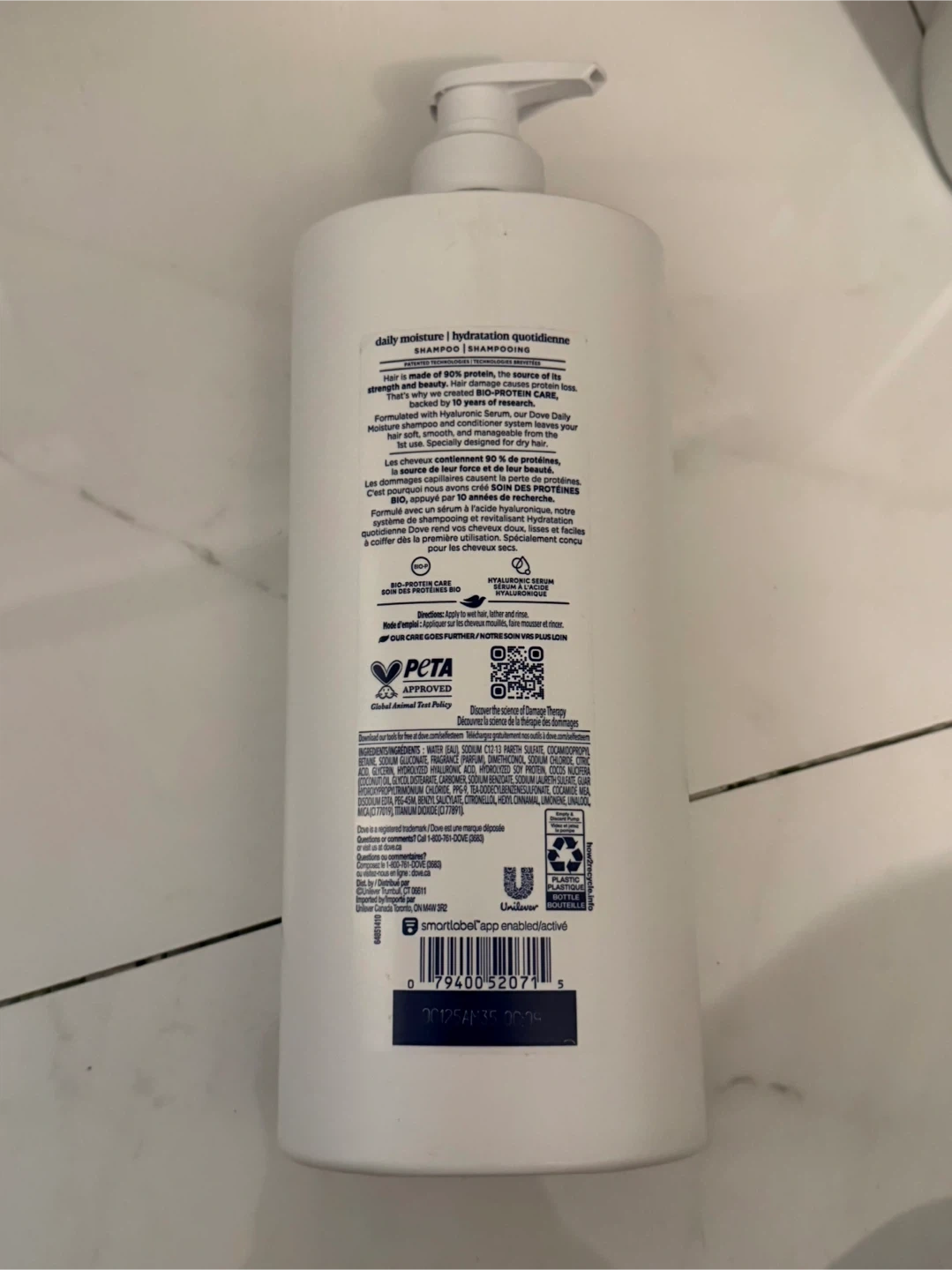 Dove Daily Moisture shampoo for damage therapy. It contains bio-protein care and hyaluronic serum. The production date is 2025 June 12