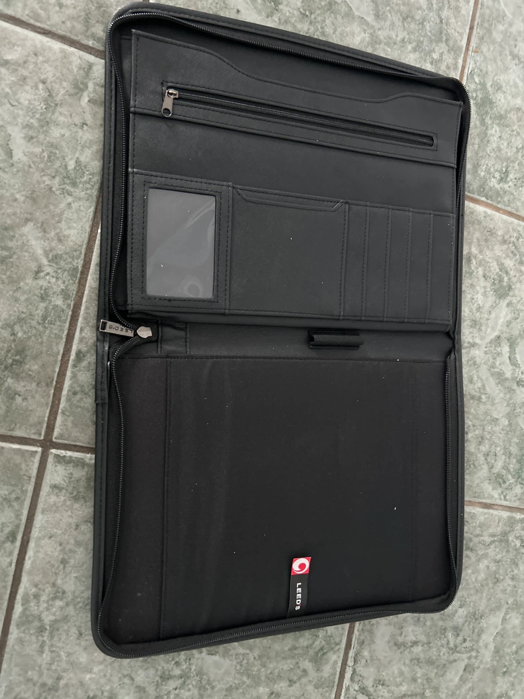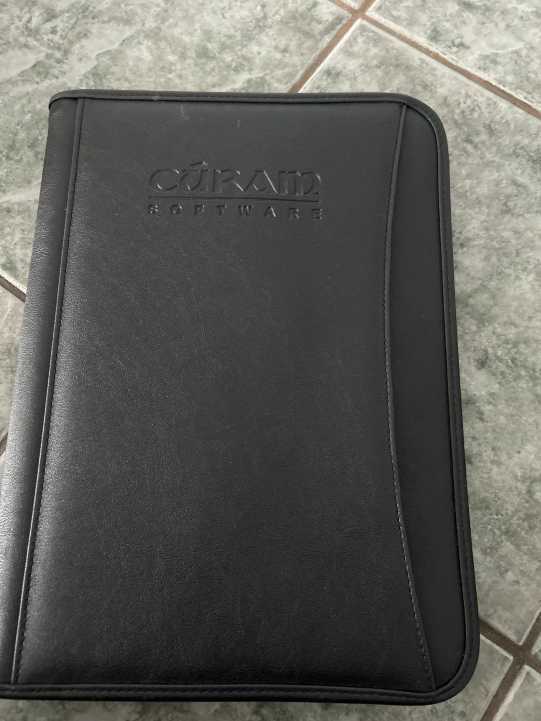 Here is a black portfolio with Curam Software and Leeds logos. It has several compartments and pockets for organizing your documents and accessories. It's in great condition and ready to keep your essentials neatly stored!