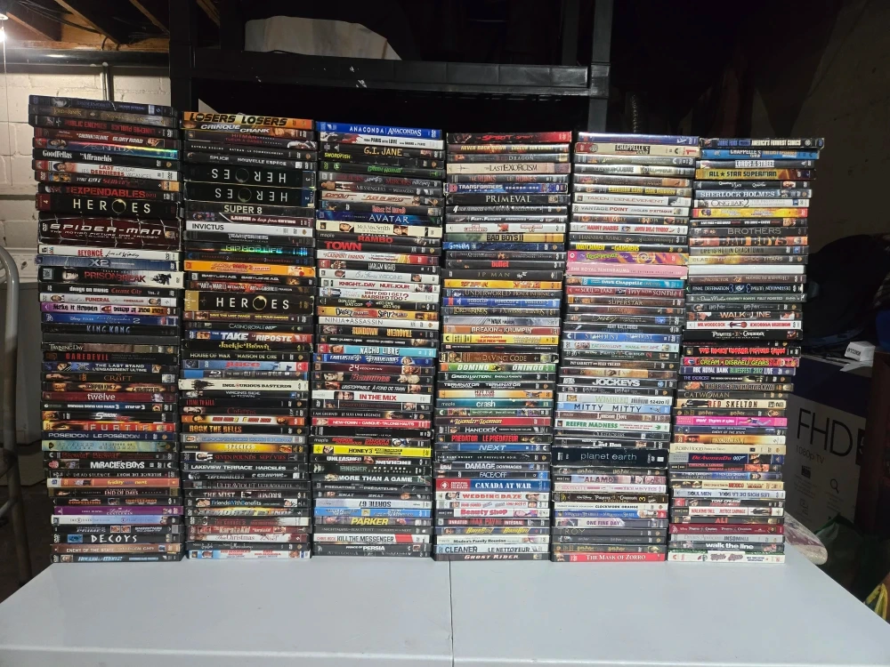 Selling a large collection of DVDs, including a variety of movies and TV shows. Titles include: Goodfellas, Heroes, Avatar, King Kong, Daredevil, and many more! Great for anyone looking to expand their home entertainment options