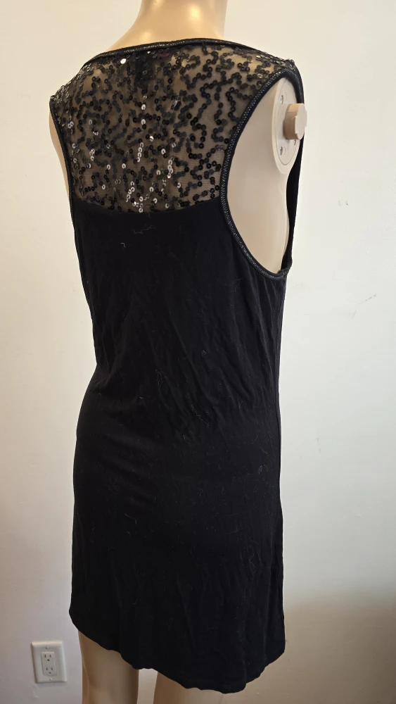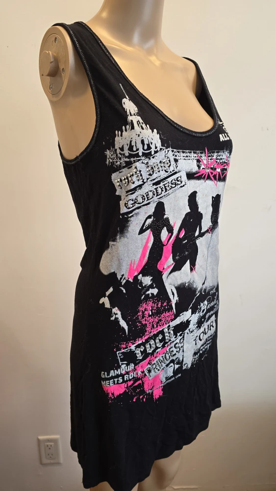 black tank top features a unique design with sequin detailing on the back. The front has a graphic print with the words "ALL GLITZ ALL ROCKING" and "The Band Goddess Tour". It's a stylish and eye-catching piece with rhinestones glitter and sheer embellished with sequins