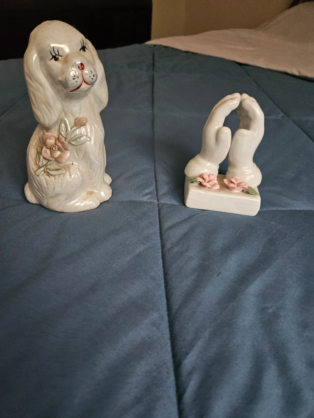 Selling these two adorable ceramic figurines! One is a sweet little dog with flowers, and the other is a set of praying hands, also adorned with flowers. They're both in great shape and would look lovely on a shelf or desk