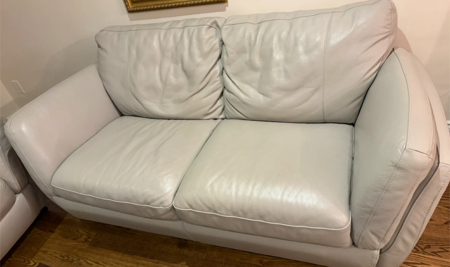 Selling a comfy two-seat sofa! It's a light grey colour and made of Italian leather. It's in good condition and would be a great addition to any living room or den.