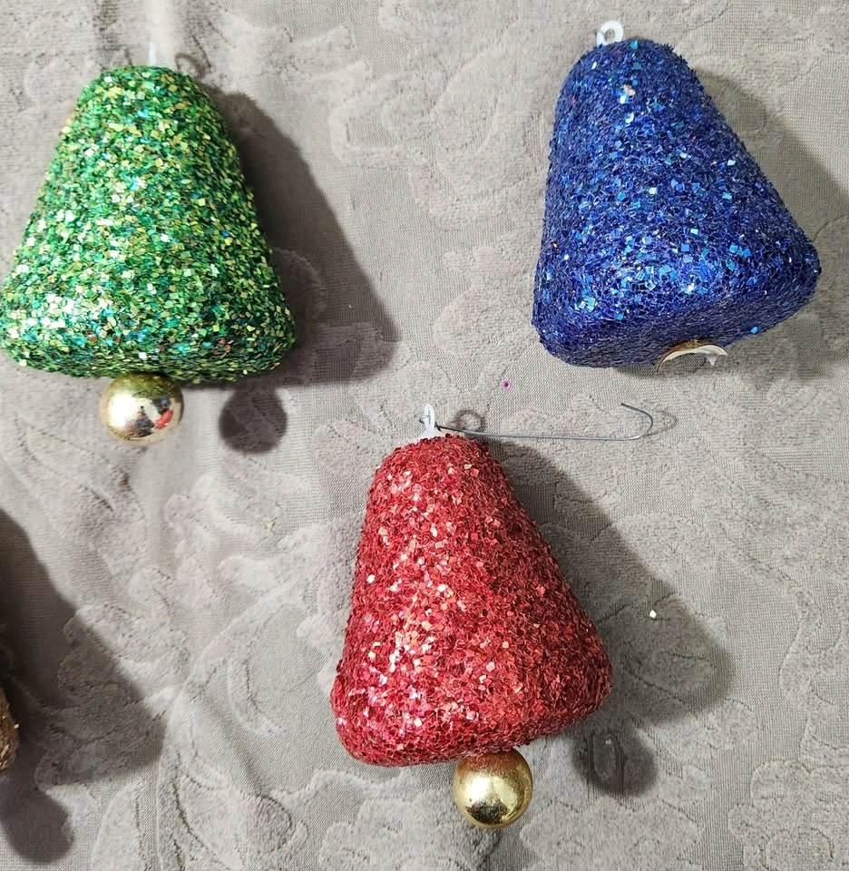 Each cone-shaped bell features vibrant glitter in classic holiday colors — red, green, blue, gold, and pink — with a gold ball clapper at the base.