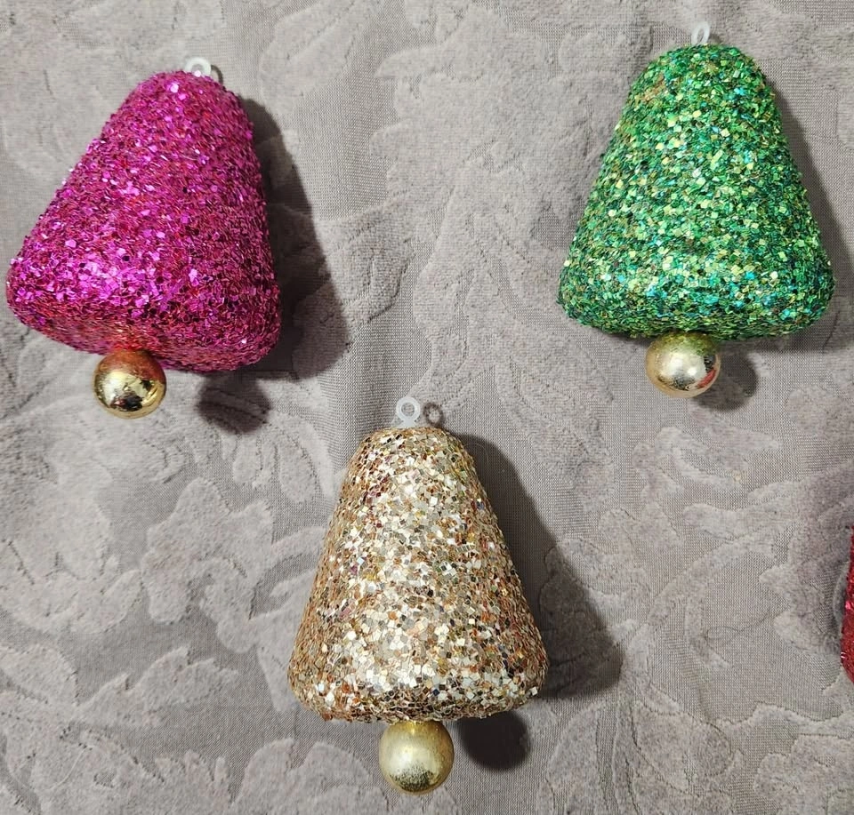 Add a touch of retro sparkle to your holiday decor with this set of 5 vintage glittered Christmas bell ornaments, dating from the 1960s–1970s.