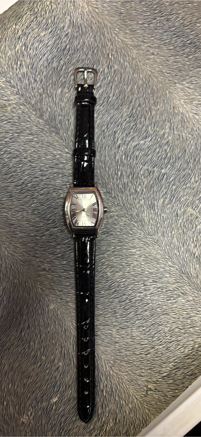 Selling a ladies' watch with a black band. It has a rectangular face with Roman numerals. The band is made of a shiny, textured material that looks like patent leather. It's in great condition!