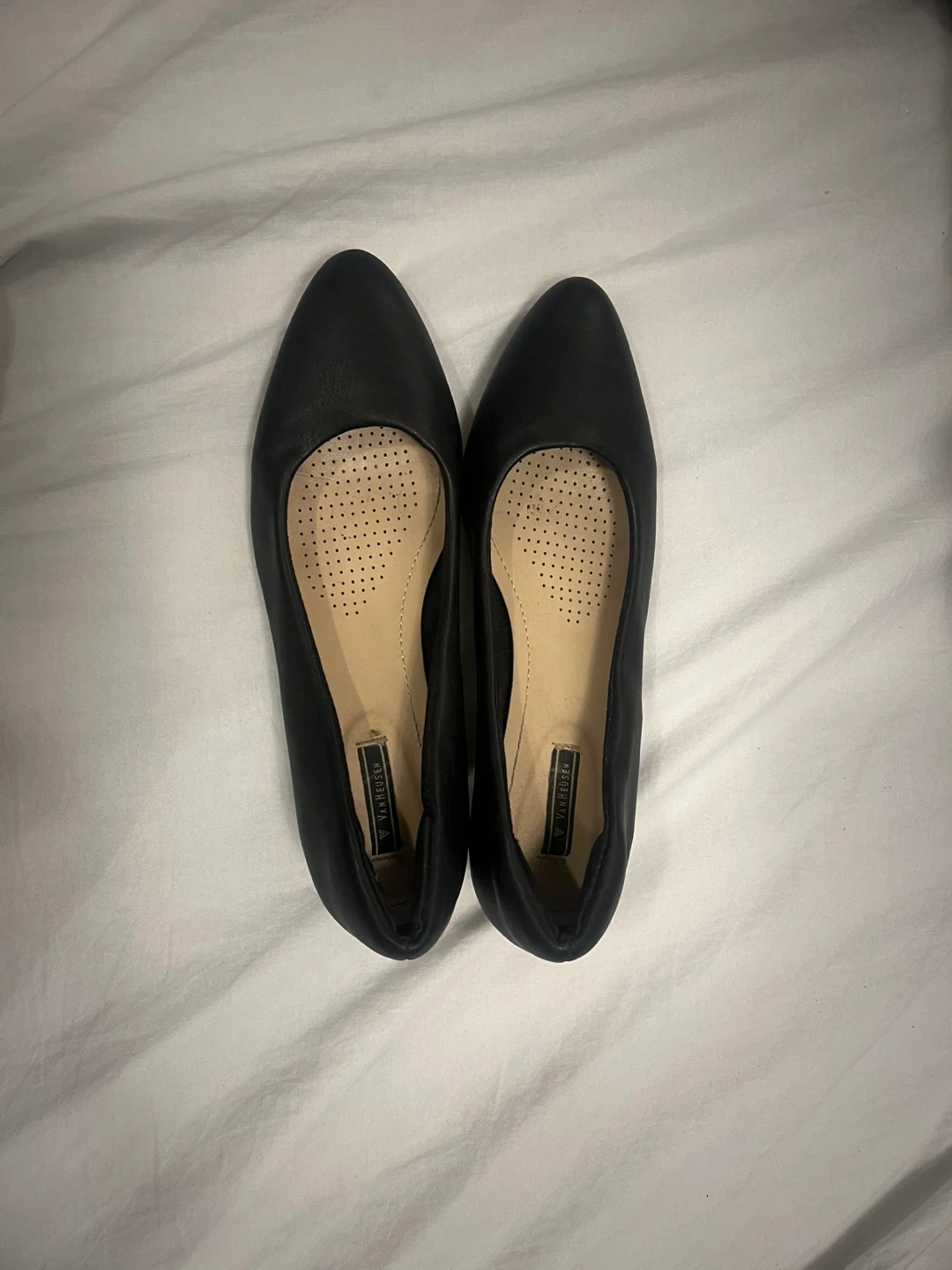 Classic and versatile Van Heusen women’s pointed-toe flats in timeless black. Designed for all-day comfort, these flats feature a sleek silhouette with a softly cushioned, perforated insole for added breathability. The smooth upper gives a polished, professional look, making them ideal for office wear, formal occasions, or everyday use.