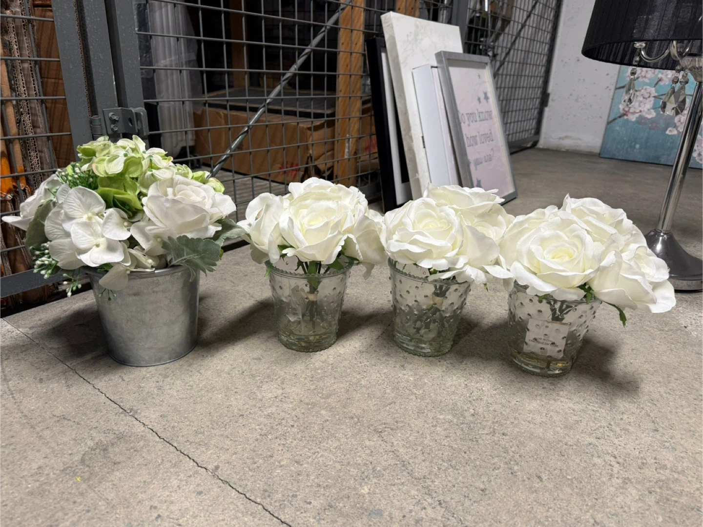 These artificial white rose arrangements are perfect for adding a touch of elegance to any space. They come in decorative vases and are in great condition. A simple and beautiful way to brighten up your home!