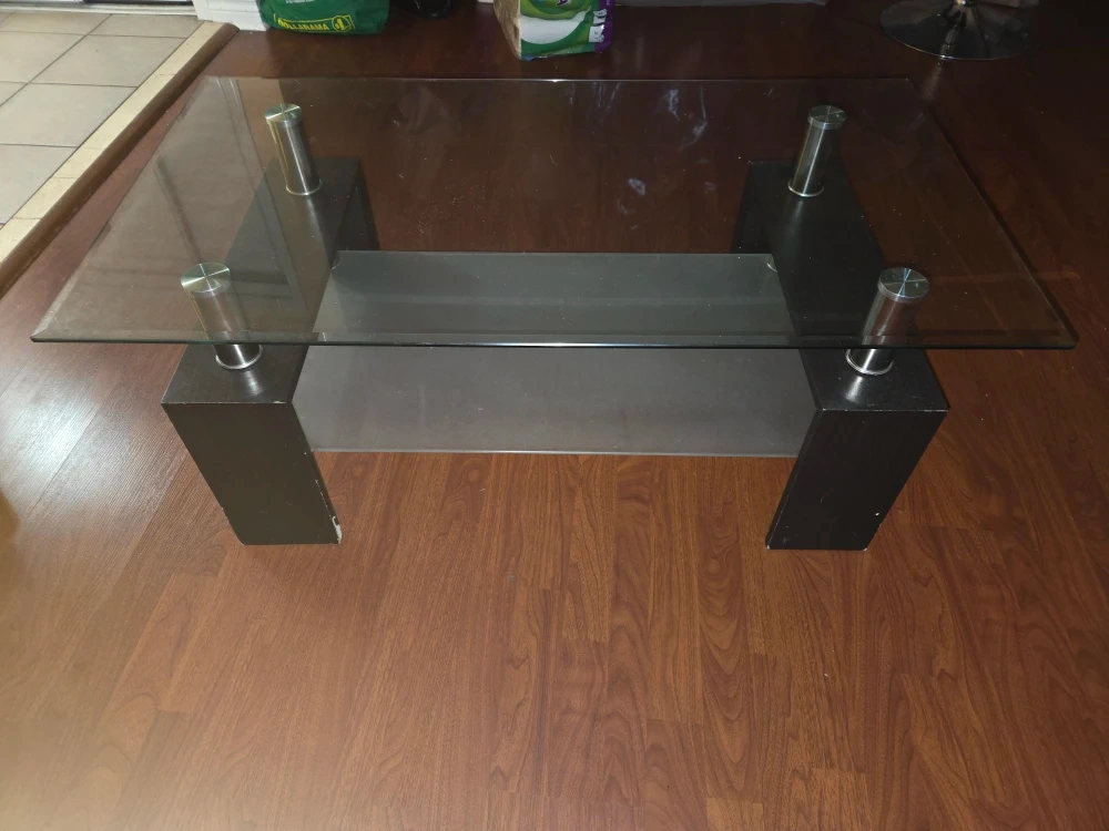 Selling a coffee table with a glass top and dark-coloured base. It's in good condition and would look great in any living room!