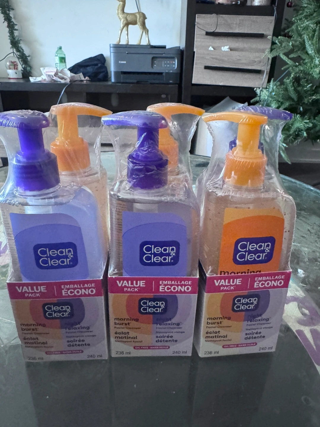 $10 each I have a few Clean & Clear facial cleanser value packs for sale! Each pack contains two different types of cleansers: morning burst and relaxing. They're oil-free and come in 236 ml and 240 ml bottles.