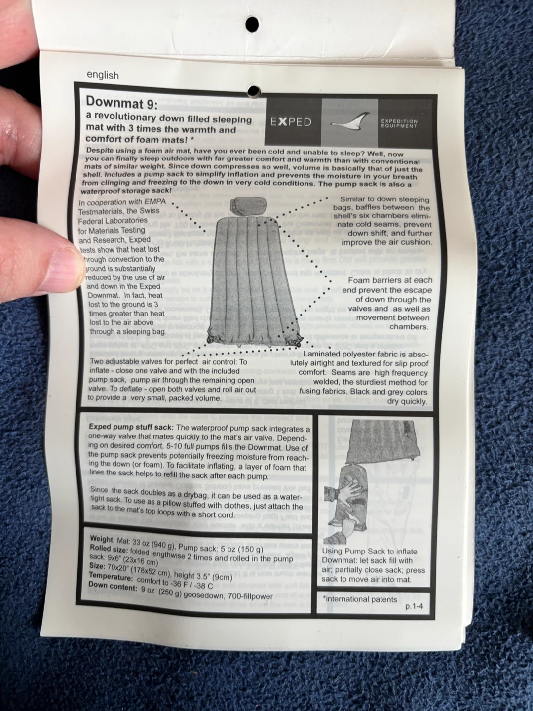 - Weight: Mat 33 oz (940 g), Pump sack: 5 oz (150 g)
