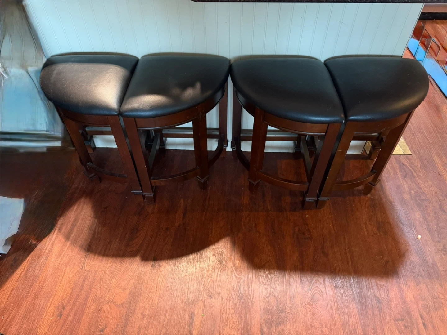 Selling a set of 4 bar stools! They're in great shape and would look fantastic in any kitchen or bar area. The black colour with wooden cherry bases is versatile and will match most decors. They have a unique quarter-moon design on the seat!
