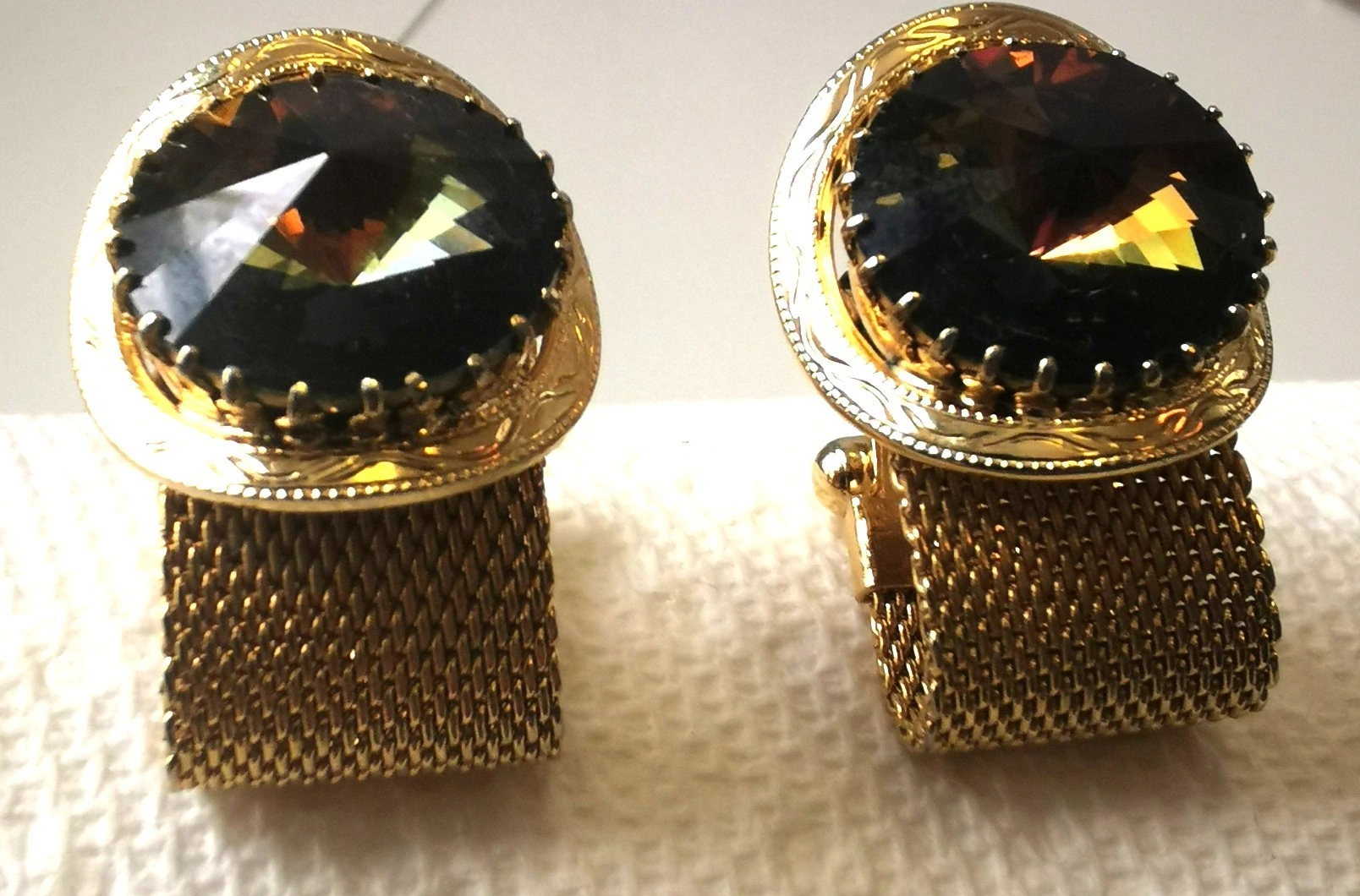 The cufflinks feature a gold color with multi-colored Rivoli glass stones.