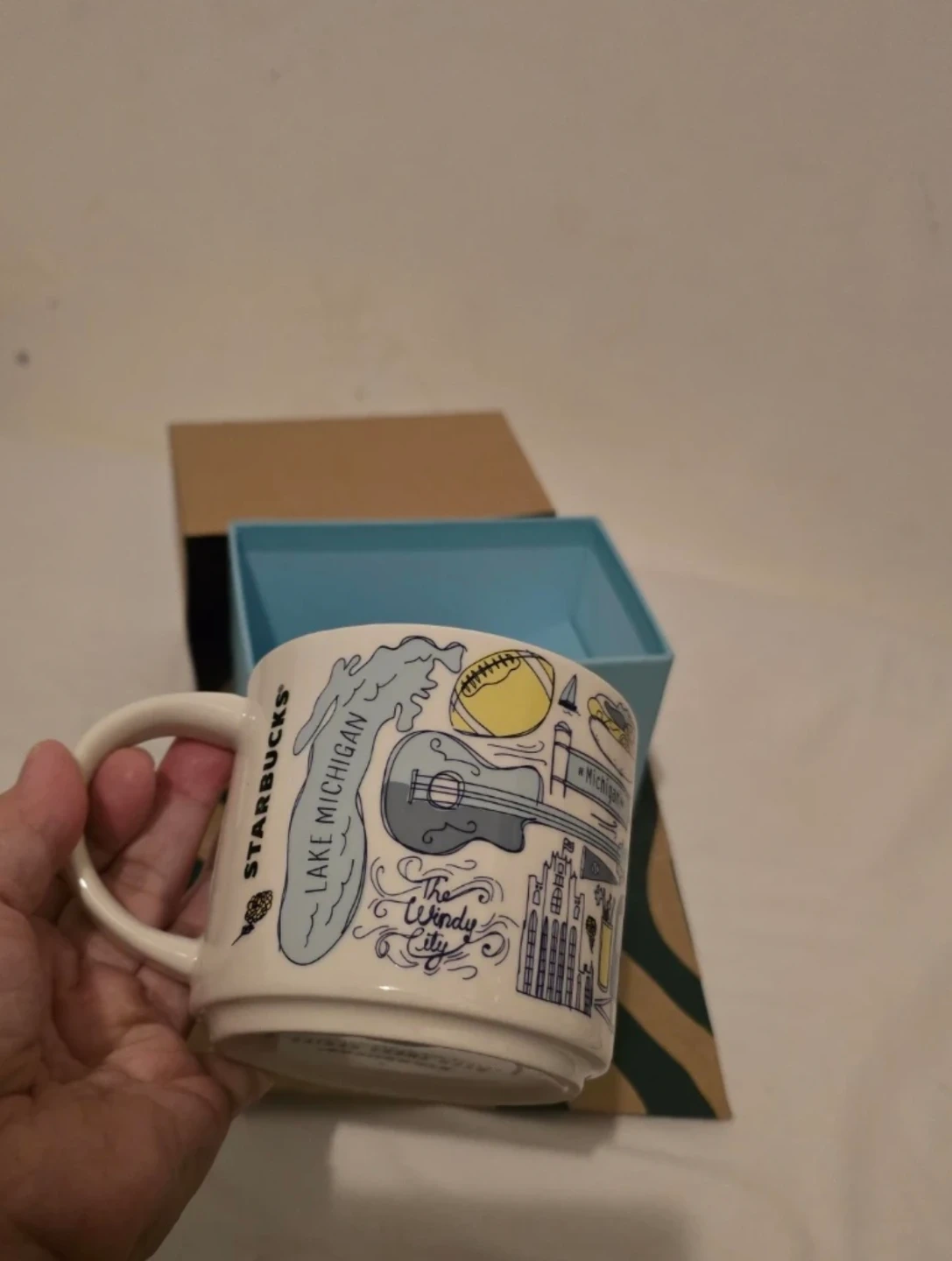 Selling a Starbucks Chicago Been There Series mug! It comes with its original box and a complementary gift tag and gift bag as pictured. Beautiful soft blue design in and out.