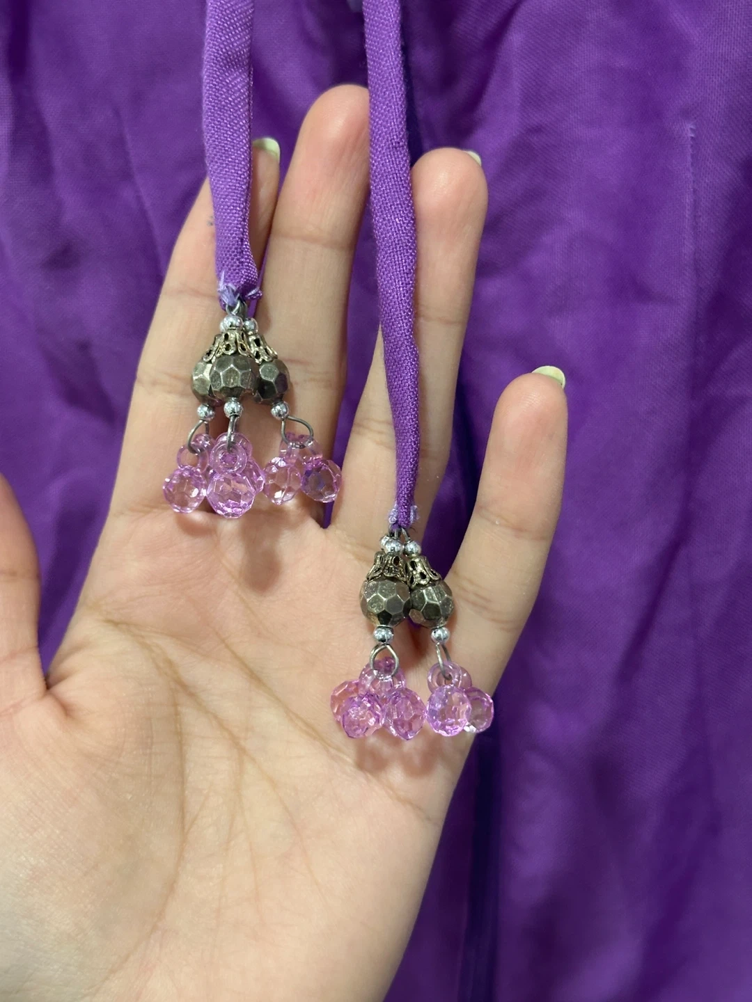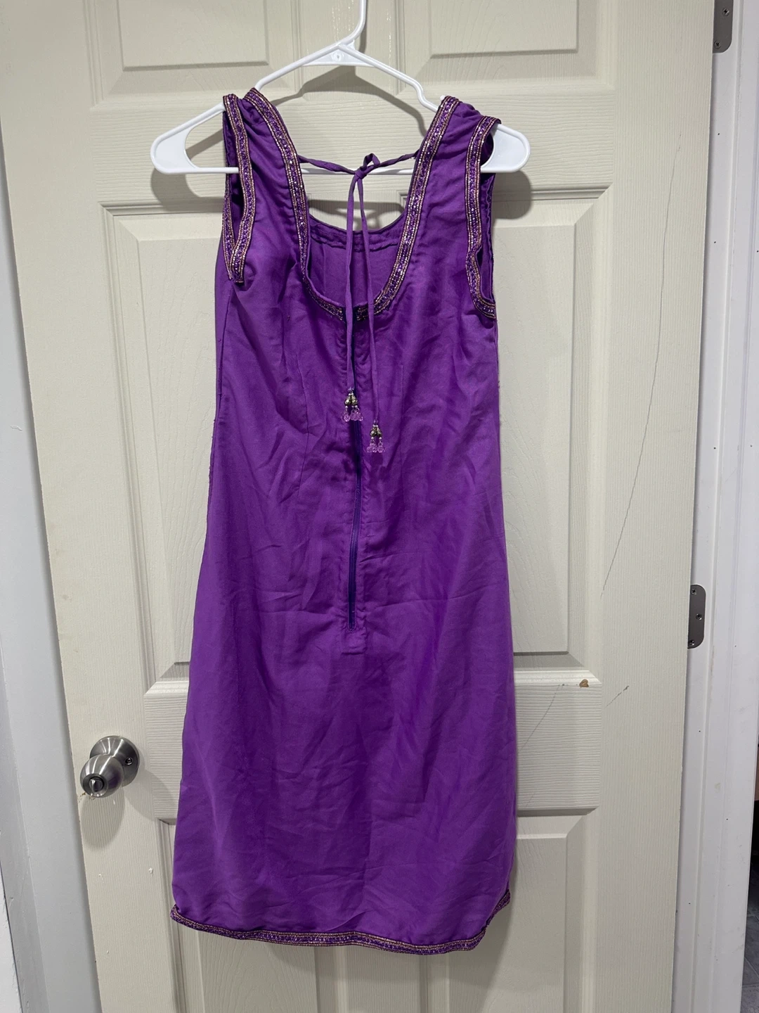 A lovely purple dress featuring delicate embellishments around the neckline and hem. It has a tie-back detail and a zipper in the back. Perfect for a special occasion or a stylish everyday look!