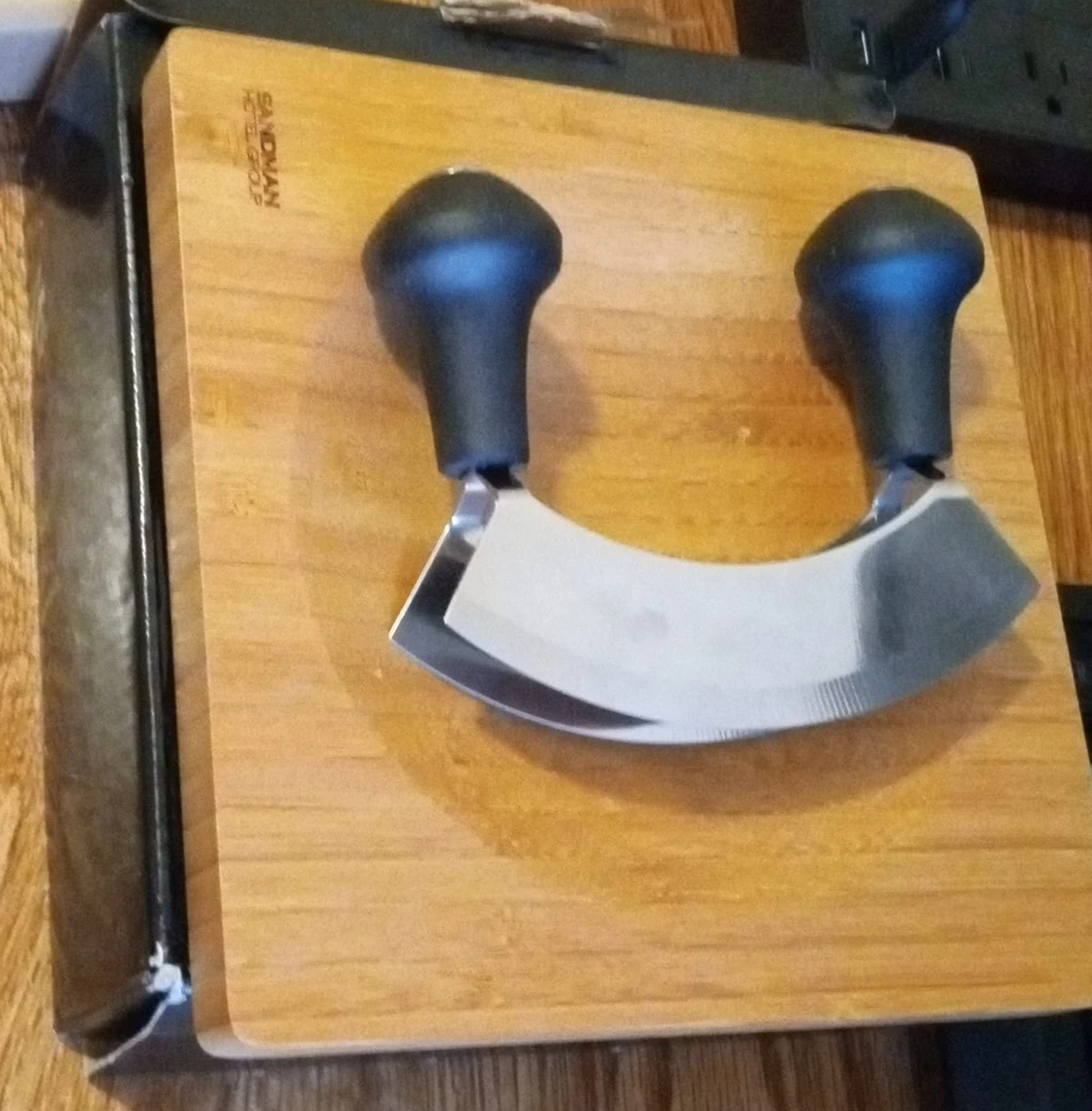 This is a mezzaluna chopper with a wooden board from Sandman Hotel Group. It comes with its original box. I took off the protection so that it would look good in the photo. It has never been used before. May it be auspicious for its buyer.