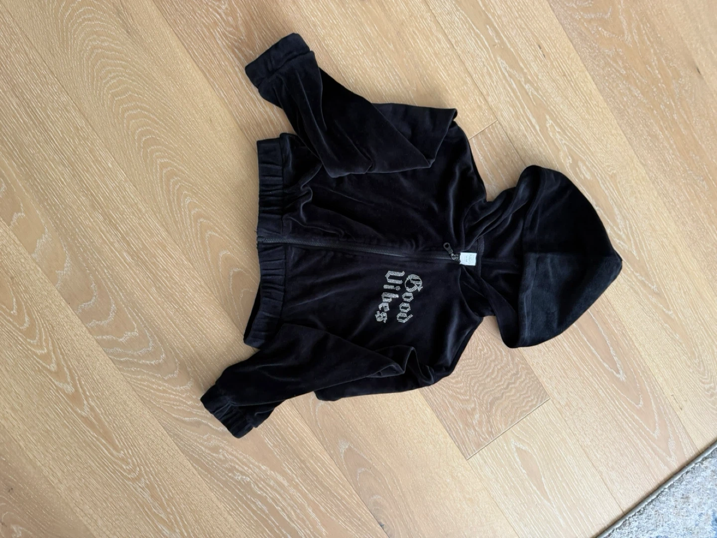 Here's a super cute Urban Kids velour jacket! It's a size M (10/12) and features a front zipper. The jacket is black and has "Good Vibes" written on the front in silver glitter