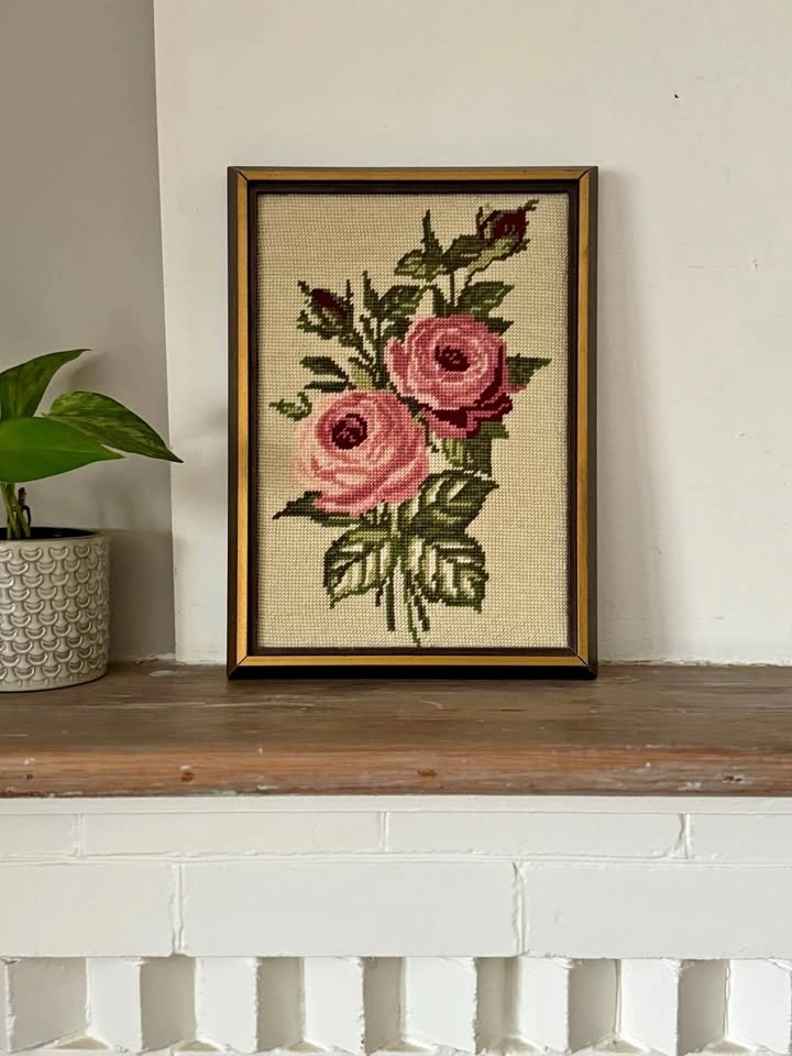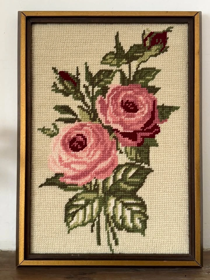 Pretty vintage framed needlepoint tapestry featuring a bouquet of pink and burgundy roses with green leaves. A lovely, classic piece of textile art perfect for adding a touch of cottagecore, shabby chic, or grandmillennial style to your home.