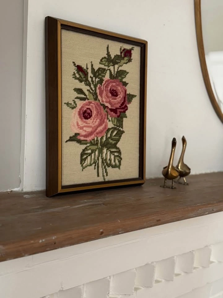 Vintage Framed Needlepoint Rose Art - Ready to Hang