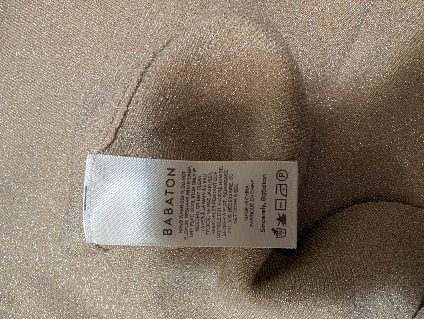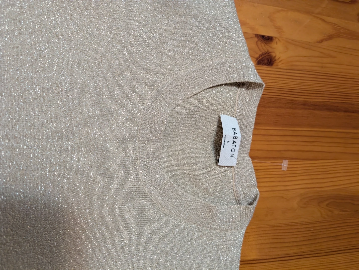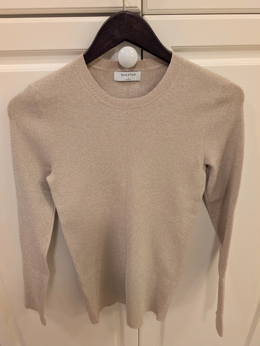 Selling a cute Babaton knit top in gold. It's a size small and new. Perfect for dressing up or down. The material has a subtle shimmer that catches the light nicely. Skeeves have thumb holes.